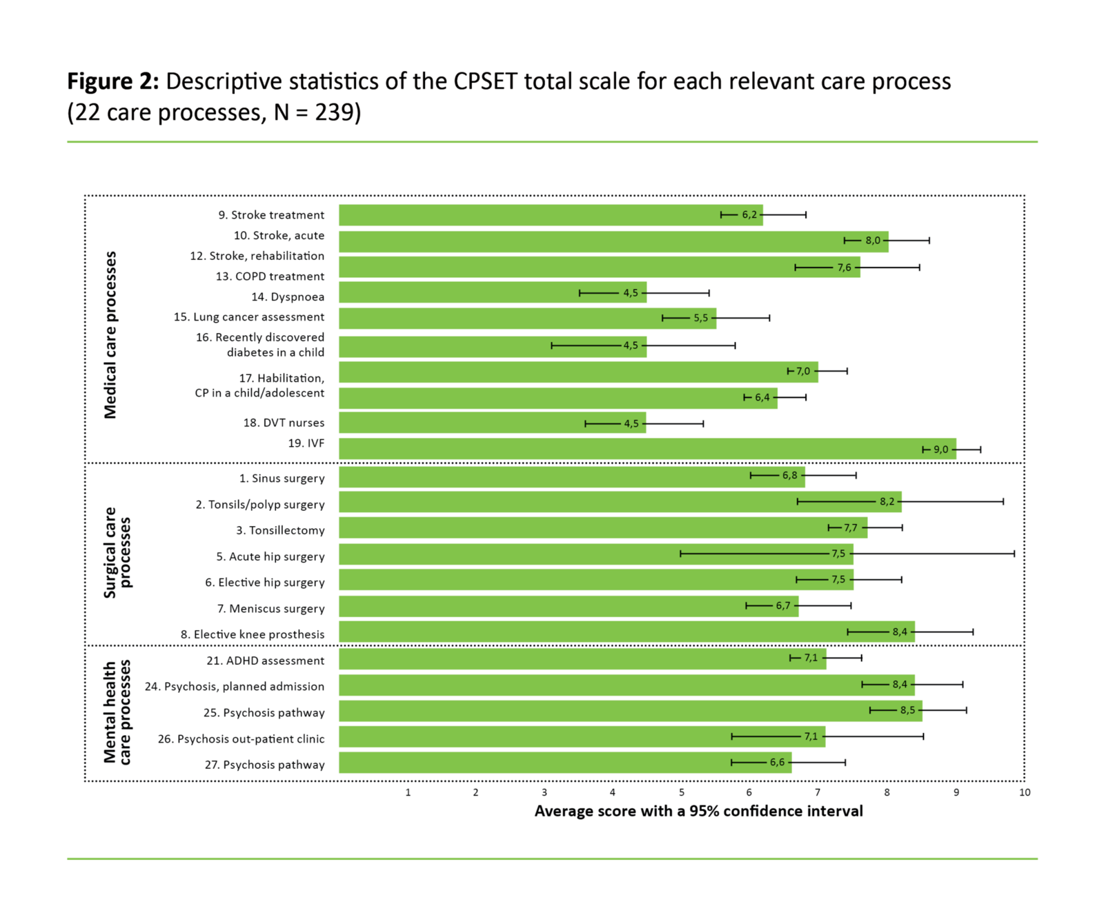 Figure 2 shows the average score with a 95 per cent CI for CPSET total scores per valid care process in the field of surgery, medicine and psychiatry. Of all the 22 care processes included, health care personnel in the care pathway ‘In vitro fertilization (IVF)’ gave the highest CPSET total score (9.0). Further examination of the average score with a 95 per cent CI in Figure 2 shows that health care personnel in the three lung-patient care processes gave a significantly poorer total score on the CPSET than most other care processes.