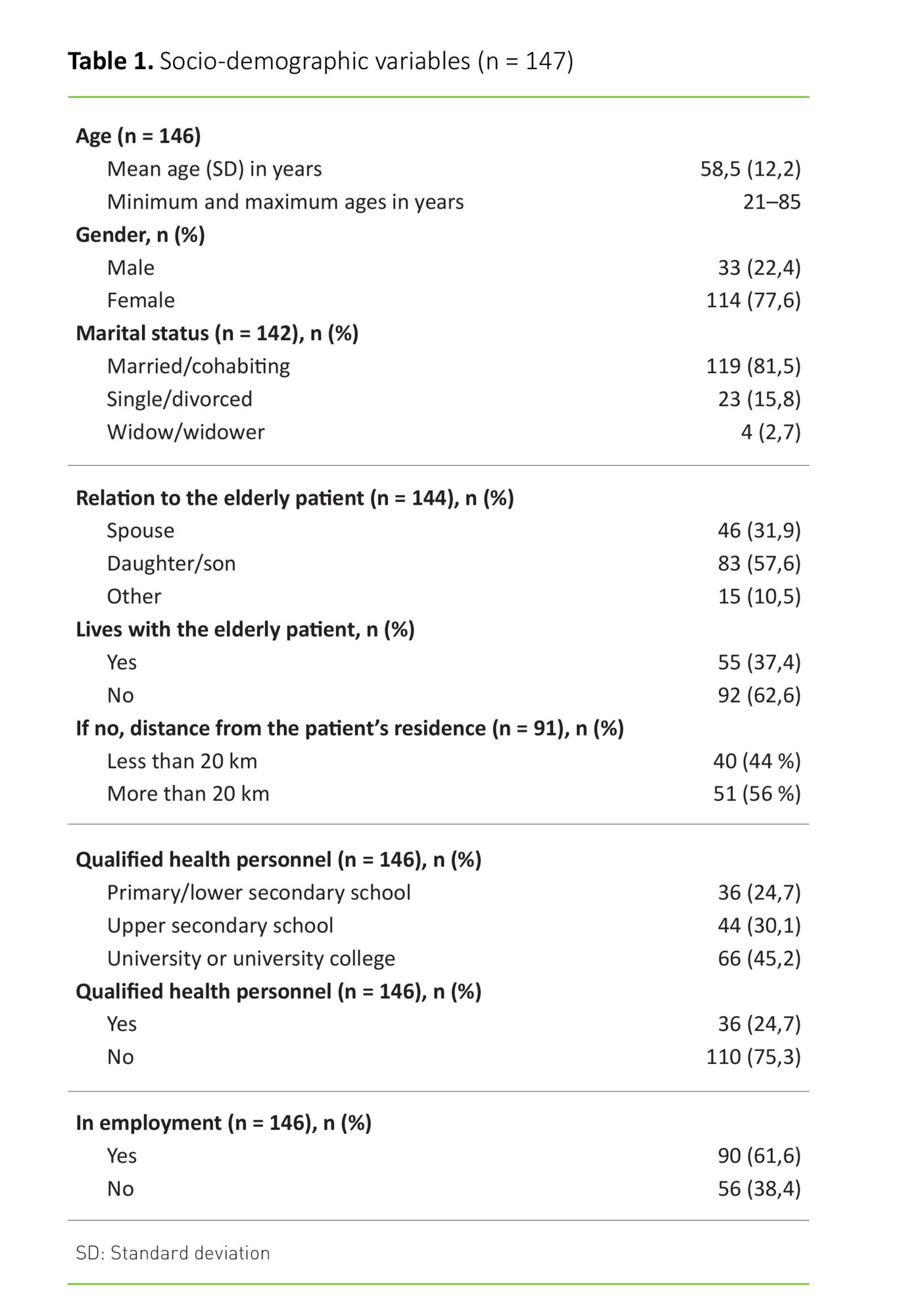 We present an overview of the socio-demographic variables in Table 1. The typical participant was a married or cohabiting woman aged 58.5 with a higher education and in employment. She was the daughter of the elderly patient, and they did not live together.
