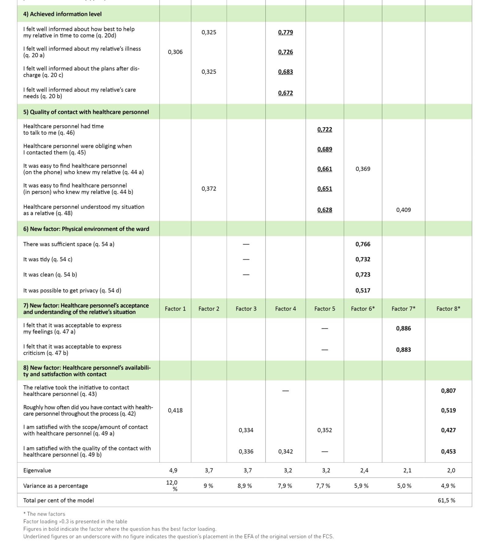 A total of 44 questions were included in the factor analysis. According to Kaiser’s criterion (eigenvalue > 1) and interpretation of the scree plot, eight factors could be included, and these accounted for 61.5 per cent of the total variance. Two of the five original dimensions were split, and three new factors emerged. Table 4 presents an overview of factors and includes the questions’ factor loading (≥ 0.3).