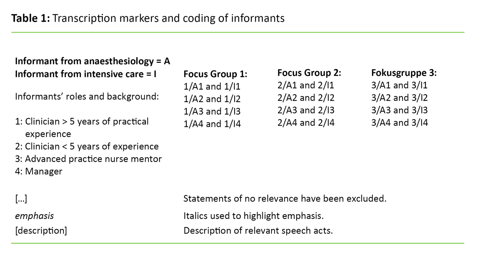 Table 1. Transcription markers and coding of informants