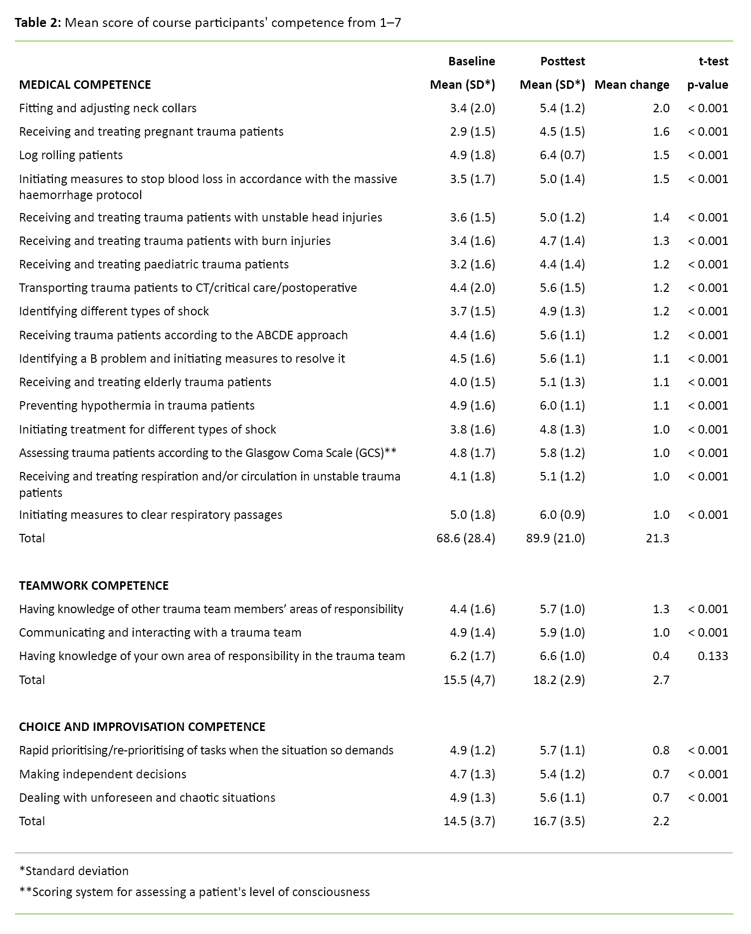 Course participants reported a significantly greater increase in medical competence and choice and improvisation competence two months after the Course in Trauma Nursing compared to the pretest (see Table 2). Course participants also reported an increase in teamwork competence, but for the question relating to knowledge of own area of responsibility in the trauma team, the increase was not significant.