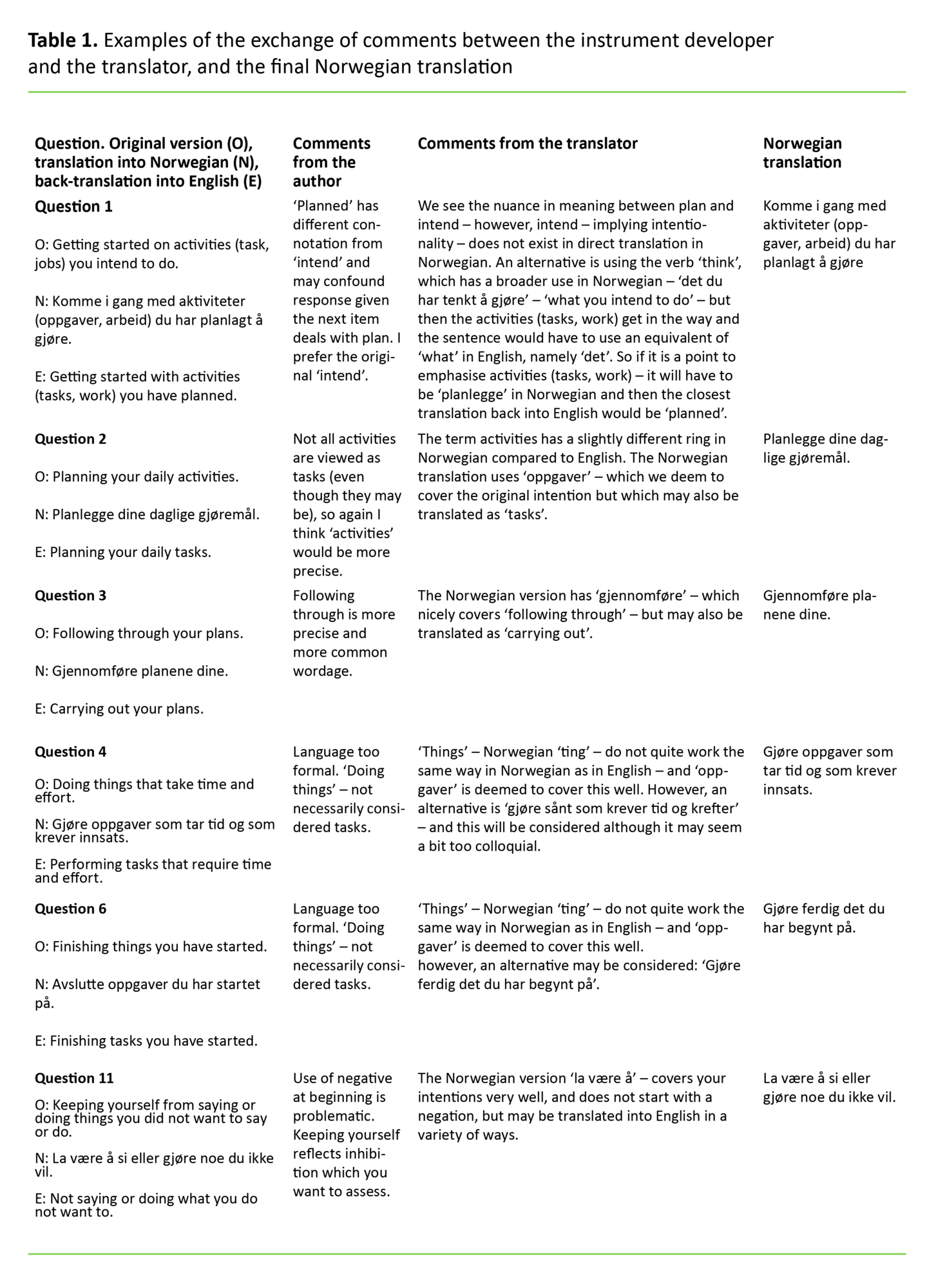 Table 1. Examples of the exchange of comments between the instrument developer and the translator, and the final Norwegian translation