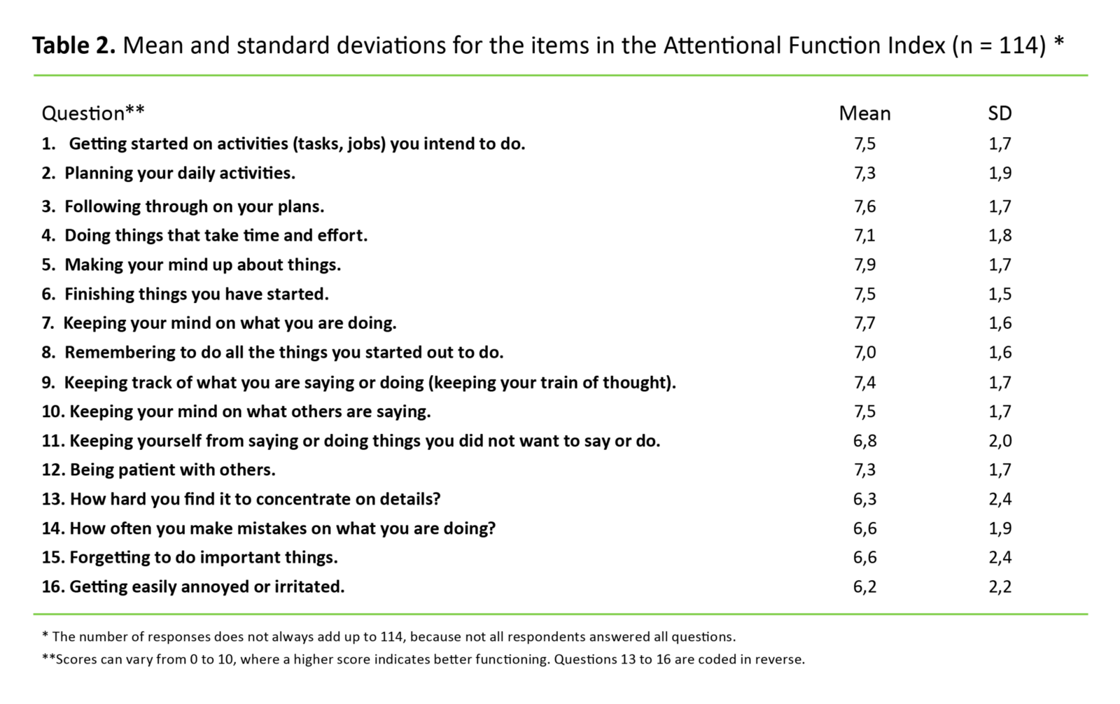 Table 2. Mean and standard deviations for the items in the Attentional Function Index (n = 114) *