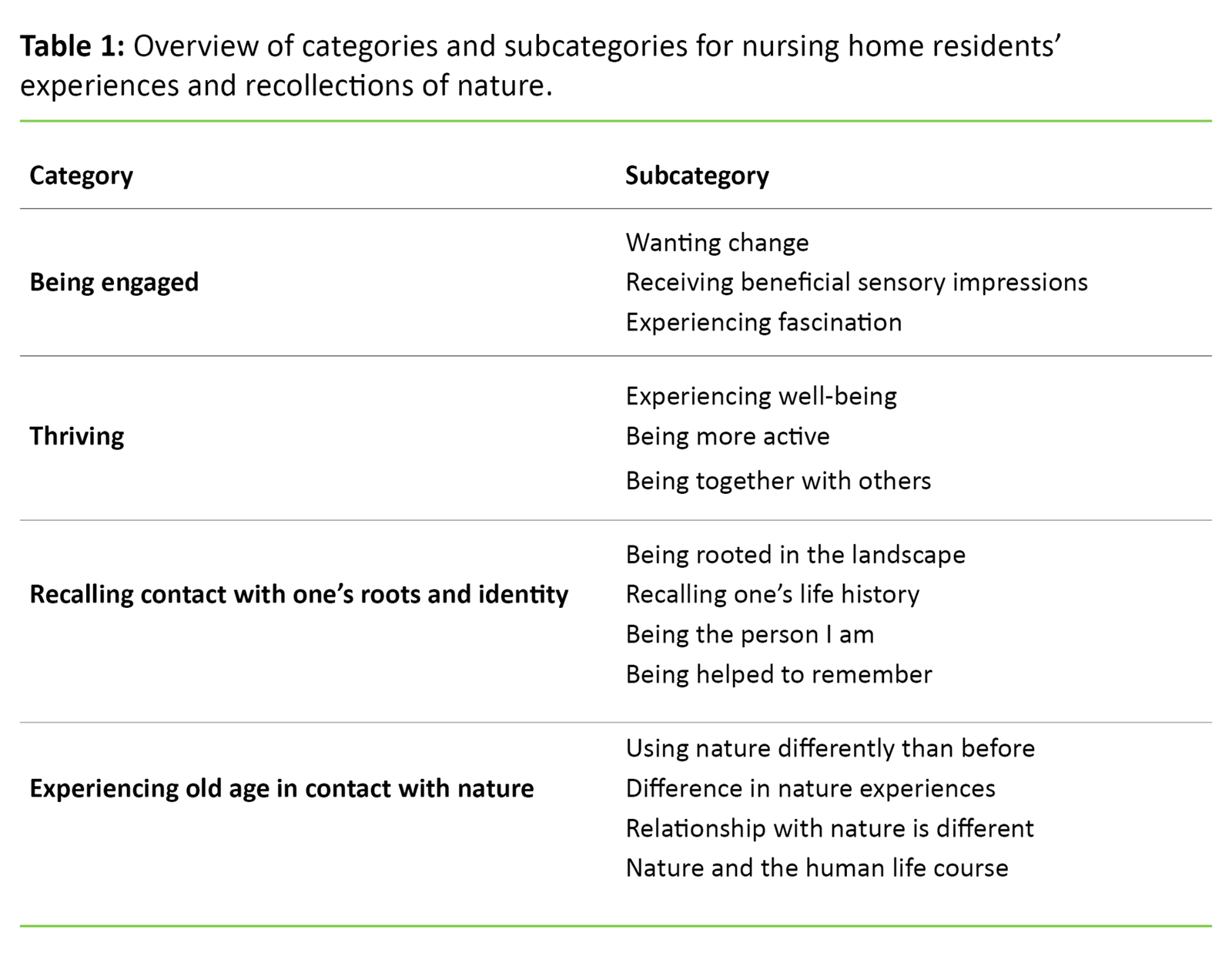 Table 1: Overview of categories and subcategories for nursing home residents’ experiences and recollections of nature