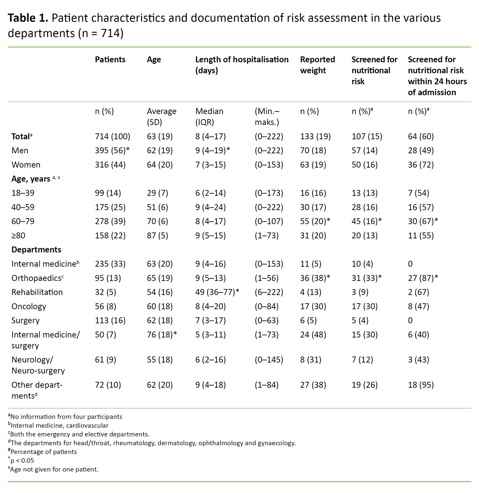 A larger proportion of patients were screened in the orthopaedic department (33%) than in the departments of internal medicine (4%, p ˂ 0.01), rehabilitation (9%, p = 0.026), oncology (30%, p = 0.191), surgery (4%, p ˂ 0.01) and neurology/neurosurgery (11 %, p < 0.01). Patients in the age group 60–79 years (16%) comprised the largest proportion screened compared to other age groups (p < 0.01). Weight was documented in 133 (19%) of the 714 medical records.