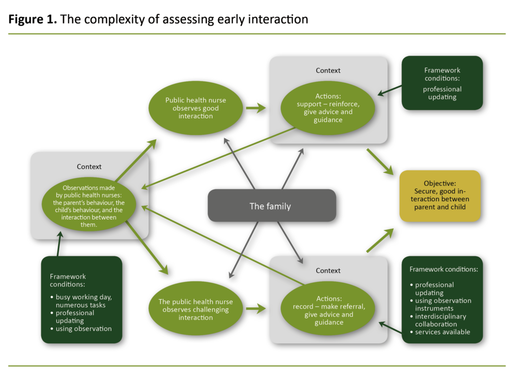 It is of great importance that public health nurses are able to assess early interactions between children and parents, and that they can assist with interaction challenges. This study suggests that the public health nurses’ assessments of early interaction make up a complex mesh of observations, actions and wider framework conditions (Figure 1).