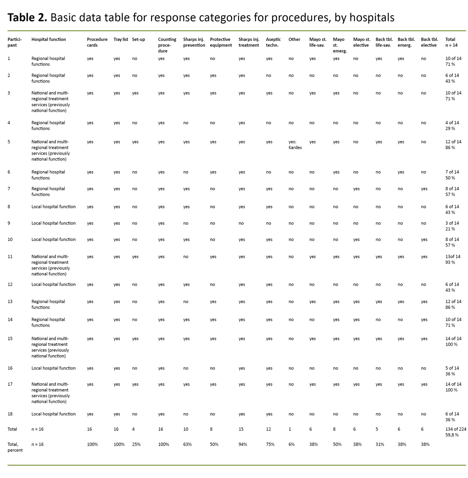 Table 2. Basic data table for response categories for procedures, by hospitals