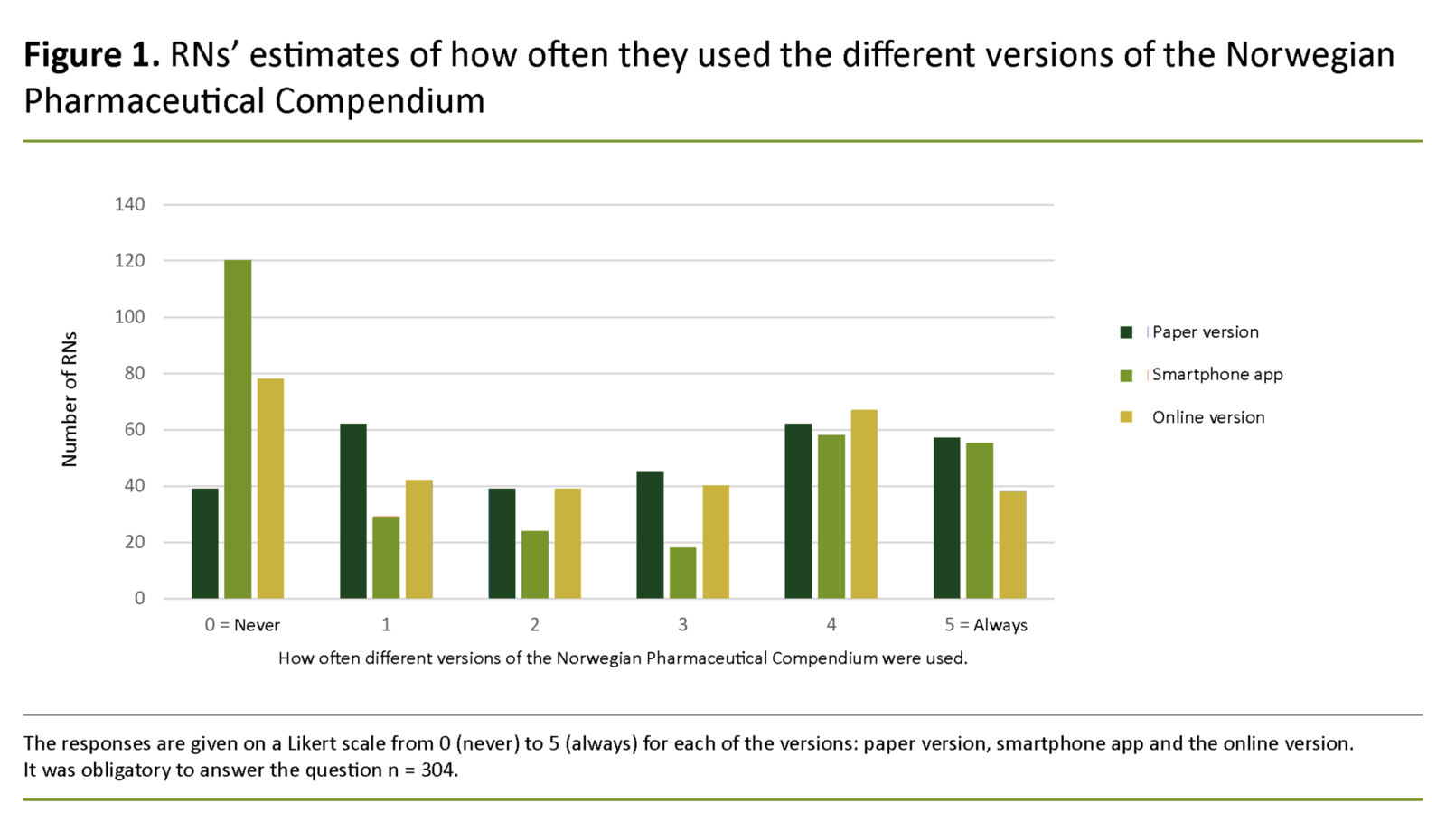 The Norwegian Pharmaceutical Compendium is available in paper and online versions as well as a smartphone app, and there was no great difference in how frequently the various versions were used (Figure 1). Thirty-three out of 304 RNs (11 per cent) never used the Pharmaceutical Compendium, either online or as an app.