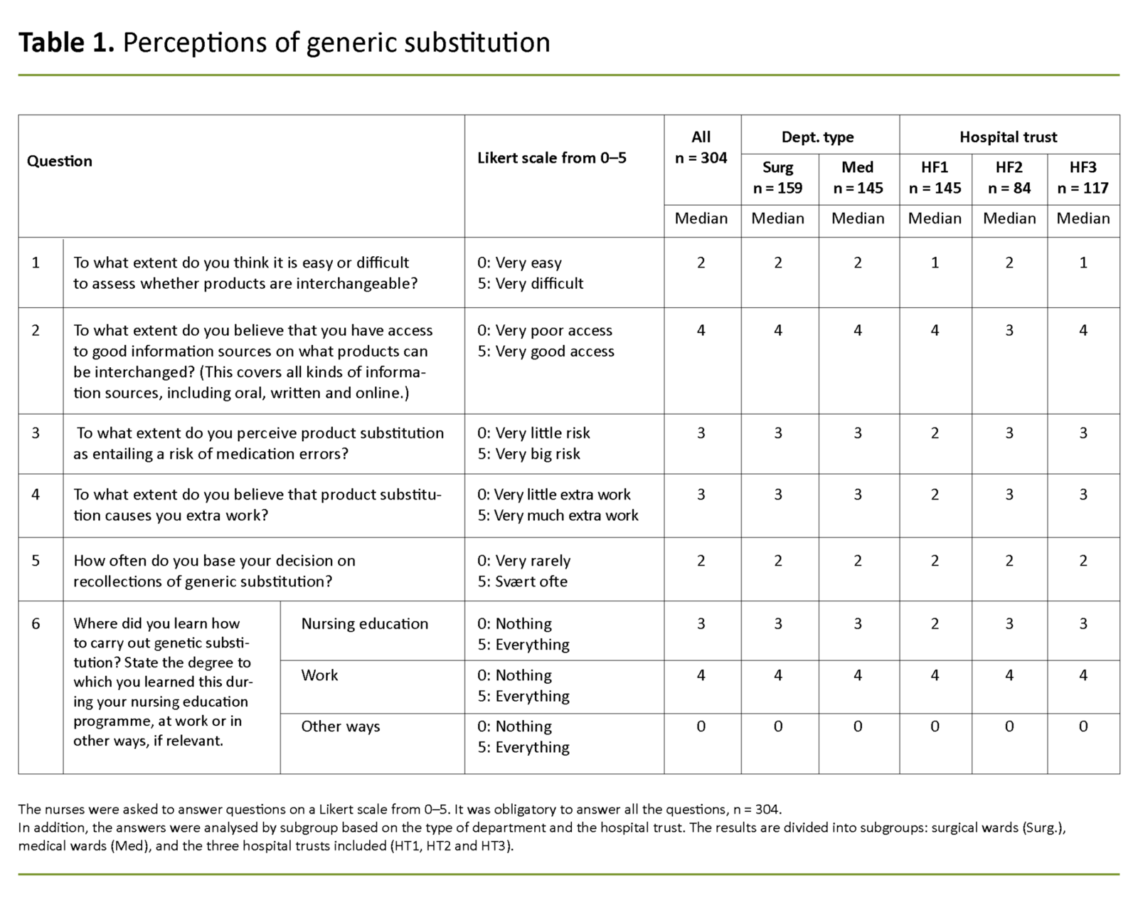 The healthcare institutions themselves decide via their quality assurance systems what substitution lists RNs can use, but only 52 per cent of the RNs knew that their hospital had such a routine. Many RNs relied to some extent on memory in relation to generic substitution (Table 1). Even though you remember products you substitute often, you must be certain that such knowledge originates from an approved substitution list.
