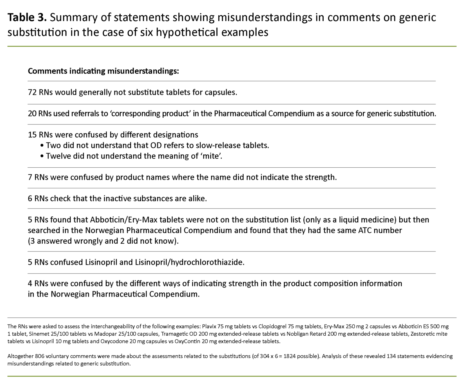 A total of 806 comments were reviewed and analysed to find statements that revealed misunderstandings and errors in the way in which the RNs carried out generic substitution (Table 3). The most frequent misunderstandings were that capsules and tablets generally could not be interchanged, that reference to ‘corresponding product’ in the Norwegian Pharmaceutical Compendium was used as a method for generic substitution, and that there was a variety of problems linked to the understanding of product names.