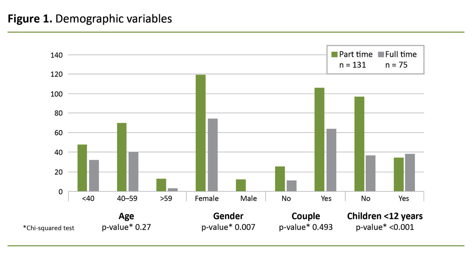 A total of 206 completed questionnaires were returned (45 per cent) distributed as follows: nursing homes 142, nursing and social care departments 41, psychiatric wards 15 and medical institutions 8. We conducted a chi-squared test to ascertain whether there were significant differences between full-time employees and part-time employees with respect to various background variables (figure 1).