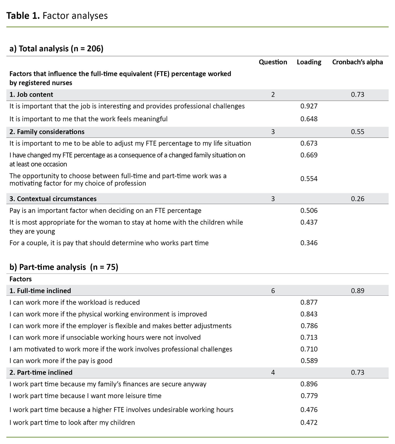 Conclusion: Job content, family considerations and contextual circumstances influence the full-time equivalents worked by registered nurses. For those who work part time, professional challenges and sociable working hours are factors that may motivate a change to a higher full-time equivalent percentage.