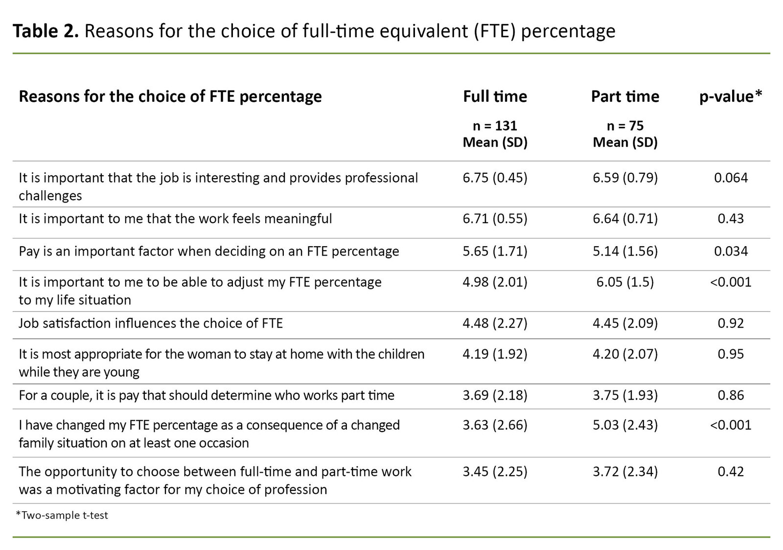 The survey questions took the form of statements about reasons for the respondent’s choice of FTE percentage. The results are shown in table 2. Professional norms appear to have the greatest impact on the choice of FTE percentage, and professionally founded reasons were prevalent in both groups.