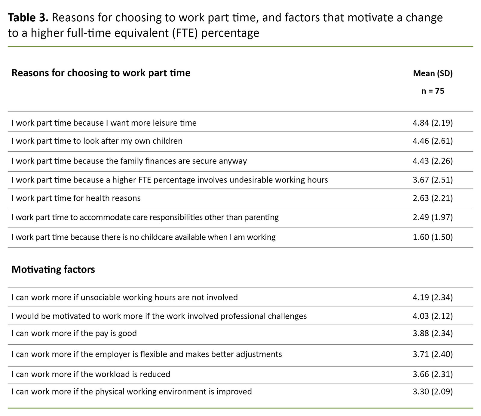 We asked part-time staff about their reasons for choosing to work part time, and what it would take for them to consider increasing their FTE percentage (table 3). Most of them had chosen to work part time in order to have more leisure time. Parenting responsibilities and secure finances were other important reasons.