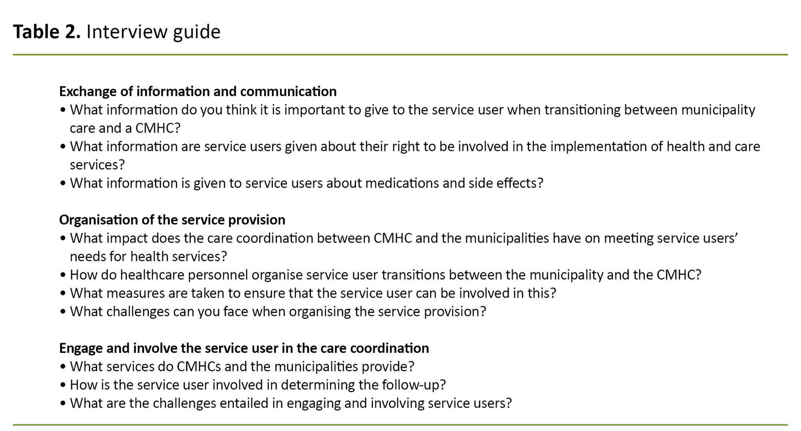 One limitation of individual interviews is that participants can withhold information or give strategic answers. A limitation of the sample in the study is that it did not include persons with an SMI or healthcare personnel from a wider range of CMHCs and municipalities. This would have produced a larger sample with more perspectives, but would also have increased the complexity of the study. The perspectives of persons with an SMI in connection with care coordination are an important area for future research.