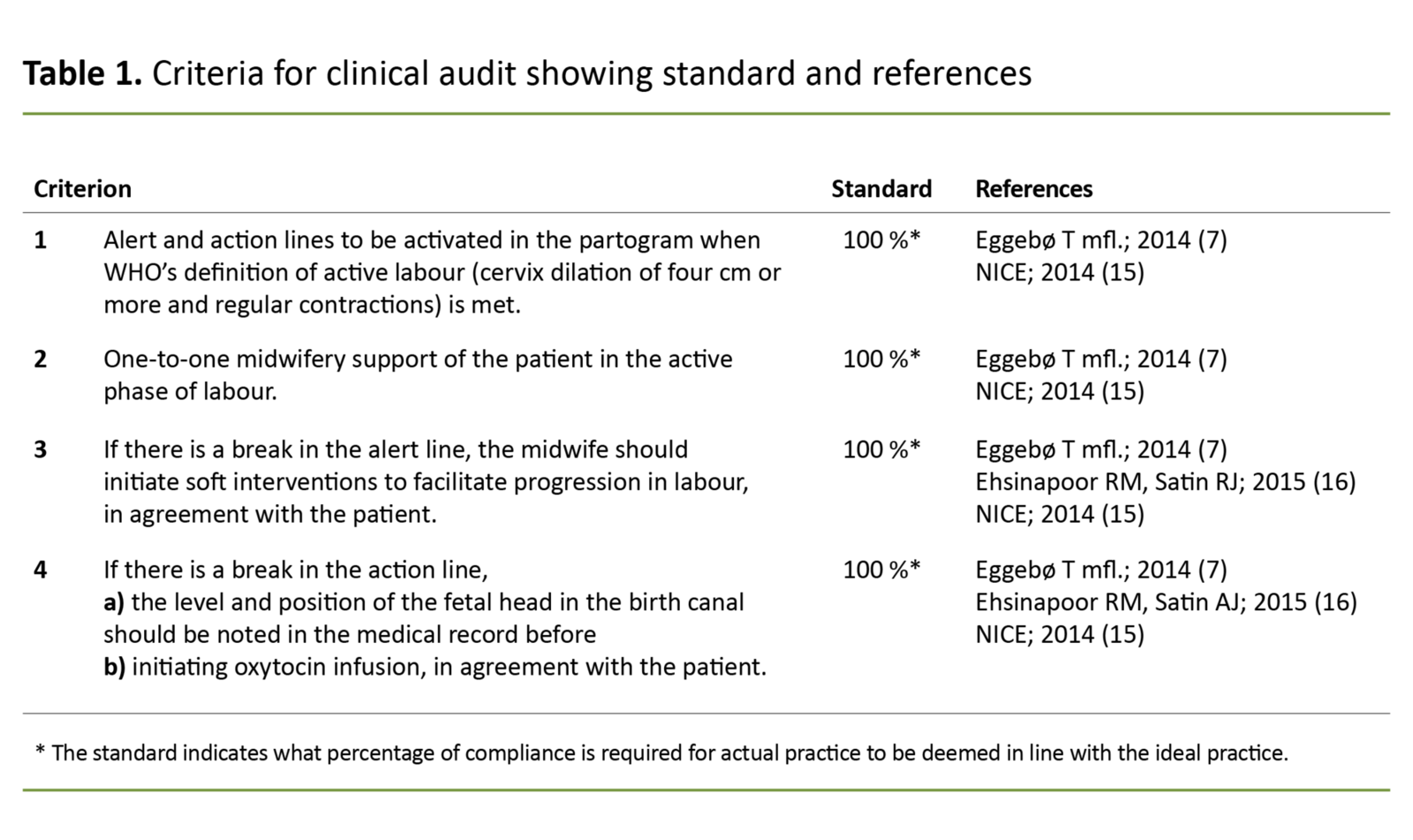 The standard for compliance with all criteria was set at 100 per cent. No optimal level has been determined for compliance with the criteria in a clinical audit, but it should be achievable in order to motivate change (13).