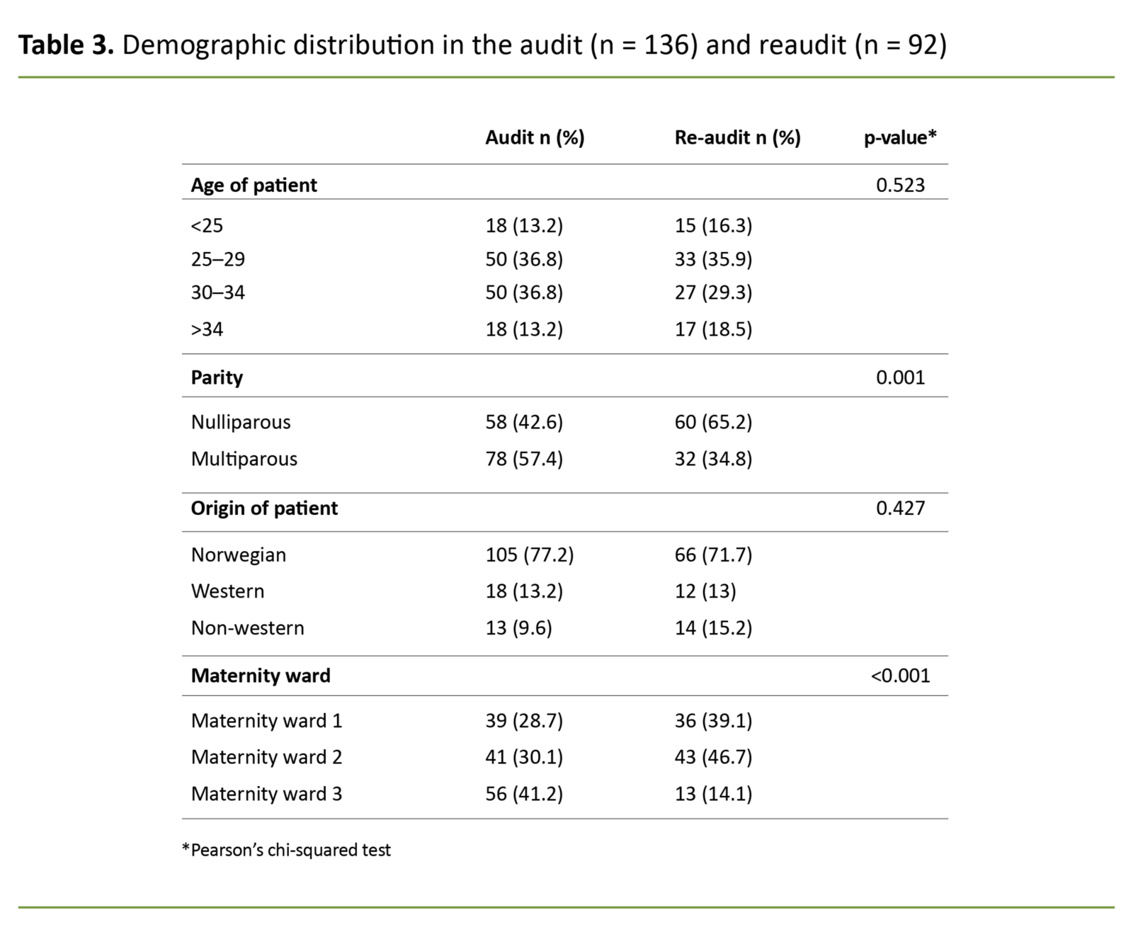 We also observed a statistically significant change in the distribution of the number of deliveries at the different wards in the audit and the reaudit (p <0.001). For other background variables, the changes were only minor (Table 3).