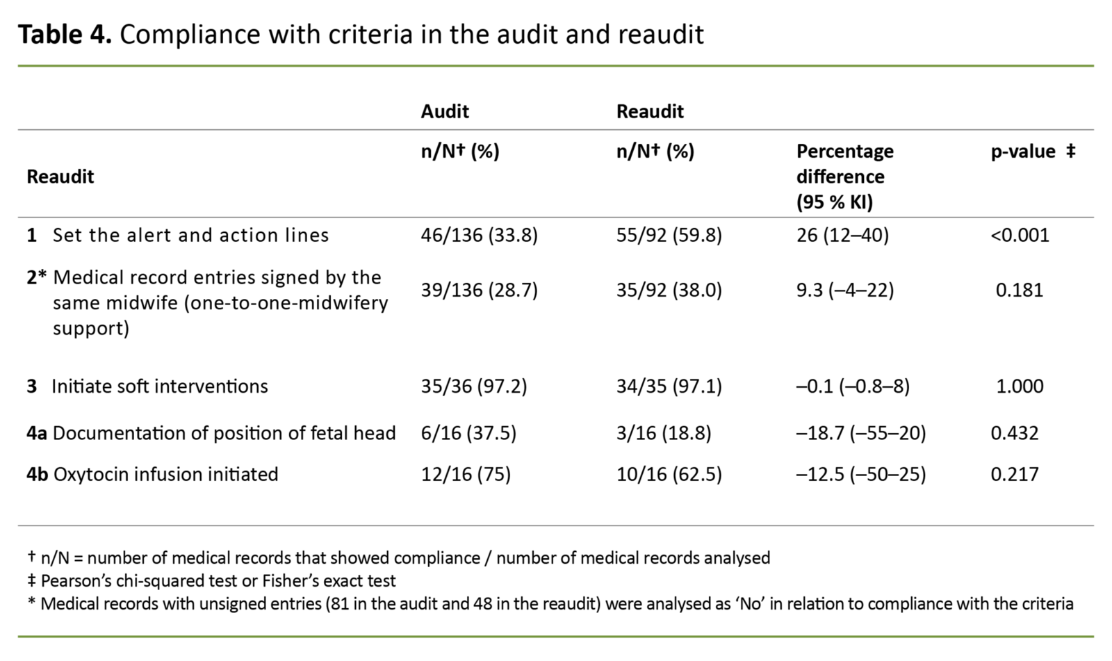 Unsigned medical entries were a surprising incidental finding because this practice violates the documentation requirement in the Health Personnel Act (30). The reaudit showed a higher percentage of medical records where all entries were signed by the same midwife, but the change was not statistically significant.