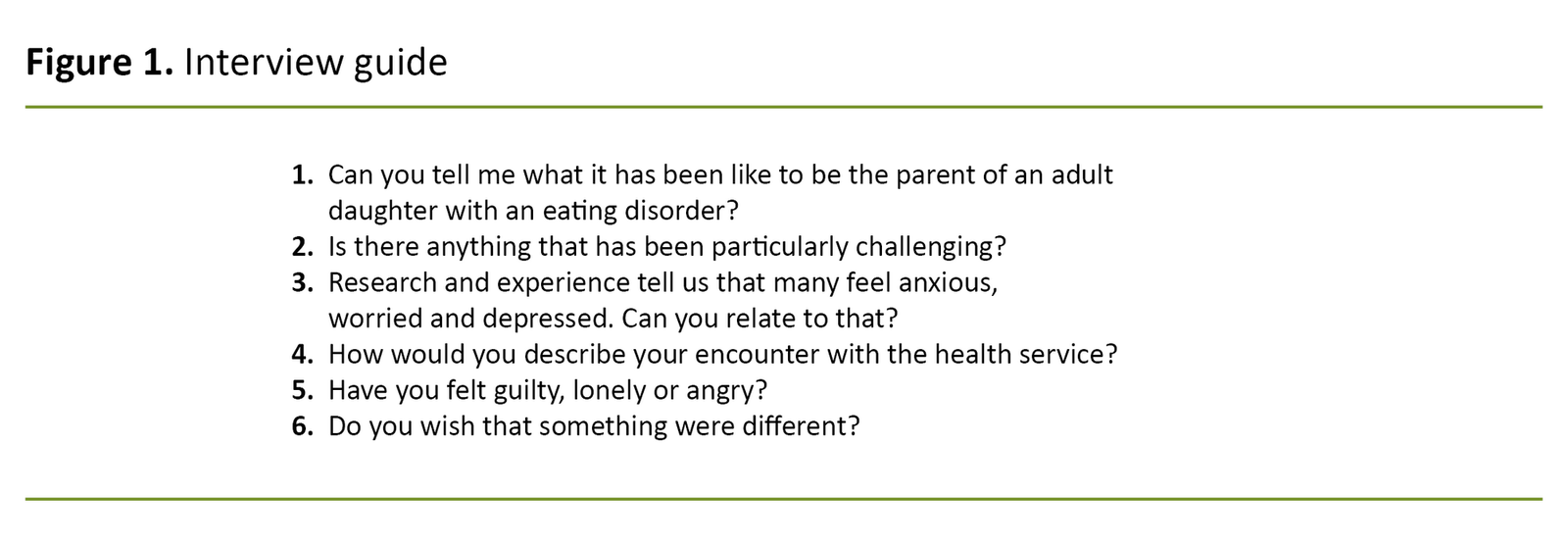 The participants were asked this introductory question: ‘Can you tell me what it has been like to be the parent of an adult daughter with an eating disorder?’ This was supplemented with additional questions (interview guide, Figure 1). We designed the interview guide based on experience from our practice and earlier research.