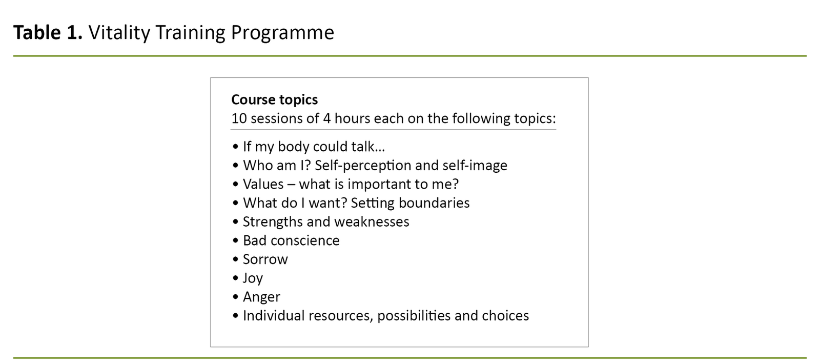 Participants in the VTP course endeavour to enhance their self-understanding. The course has been developed around ‘life topics’ that can be affected by living with long-term health problems (Table 1) (13, 14). The basis of the course is the relationship between thoughts, emotions and bodily experiences, as well as the recognition of individuals as self-experts (14). VTP course leaders are certified through a post-graduate education programme (15).