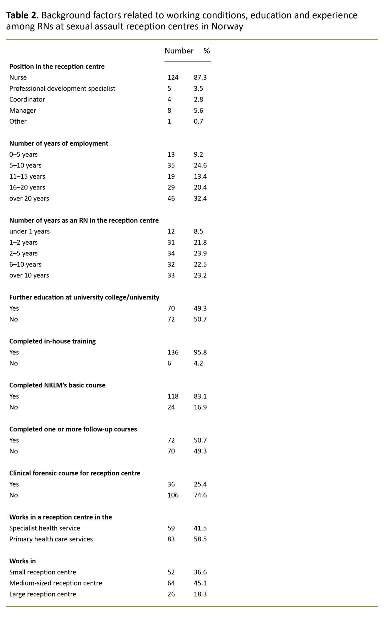 All the 24 sexual assault reception centres in Norway were represented. A total of 142 RNs out of 283 answered the questionnaire – a response rate of 50 per cent. All respondents were female RNs, and the mean age was 43.5 years (SD = 10.0).