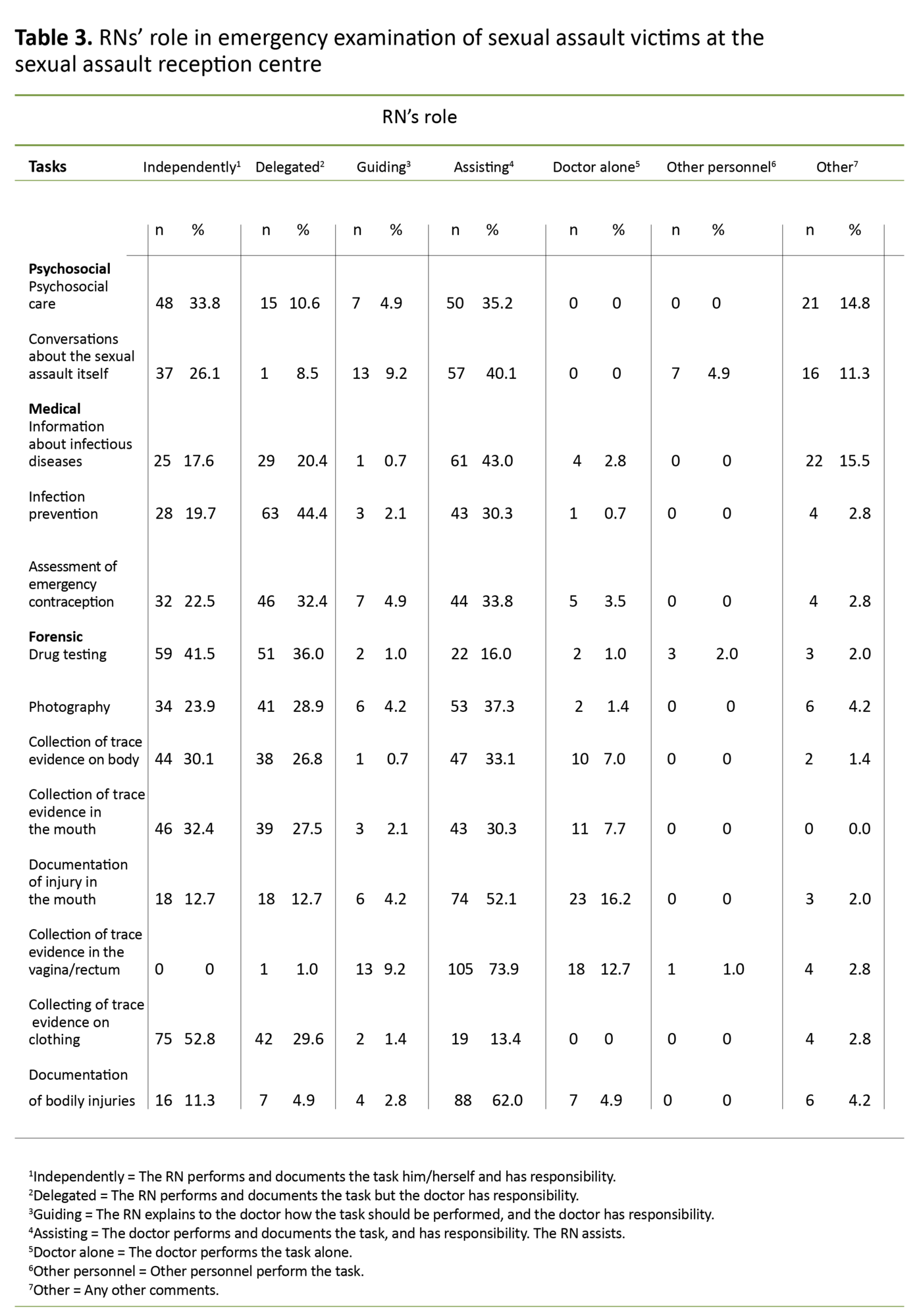 In relation to the tasks performed in the emergency examination, 33.8 per cent of the RNs reported that they carried out psychosocial care independently. The RNs reported collecting trace evidence from the surface of the body (30.1 per cent) and from the mouth (32.4 per cent) independently.