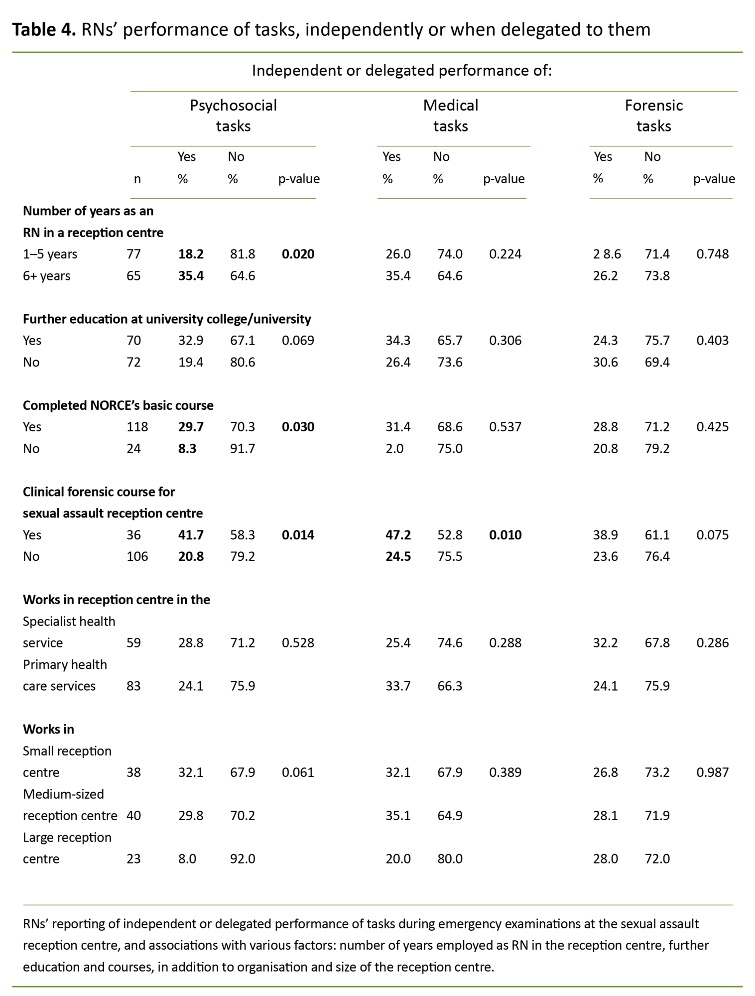 There were no significant differences between the RNs working in small and large sexual assault reception centres or between those working in reception centres in the primary health care services or specialist health service in relation to the degree of independence in how the tasks were performed.