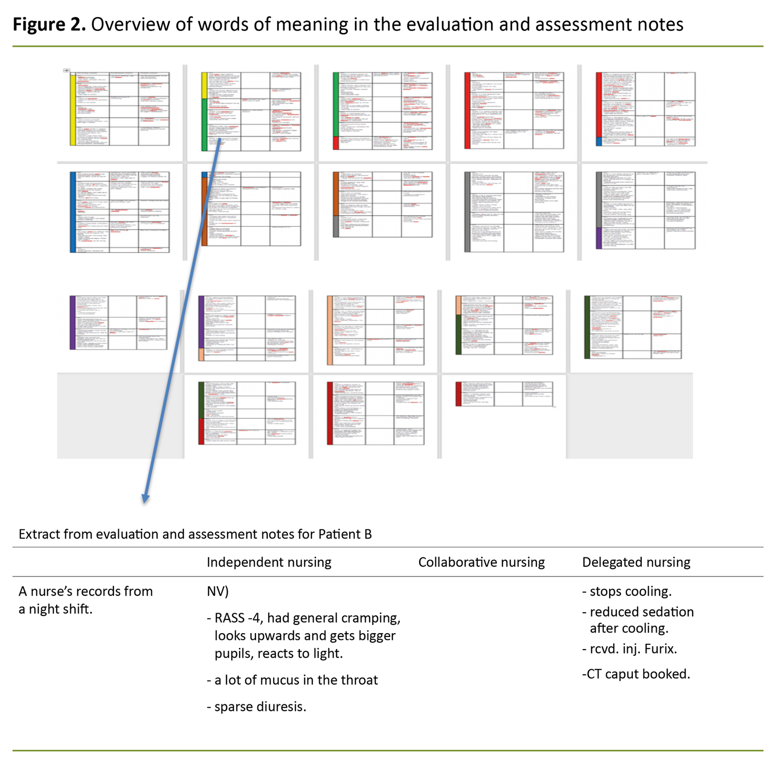 The documentation was coded with colours for each patient (Figure 2). The first author sorted the text in a Word document, and the co-authors participated in the analysis work and identification of the discourses.