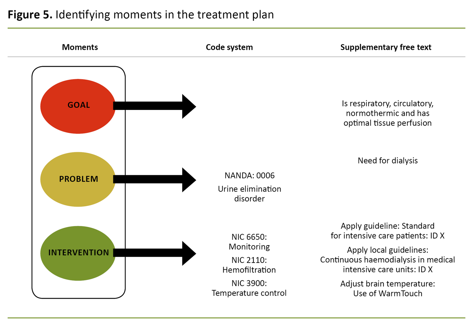 The nodal point plan calls attention to a structuring of nursing, where a traffic light colouring system is used. Amber, which can be associated with failure, warning and illness, corresponds to the problem moment, where the patient’s problem is defined. The NANDA diagnosis urinary elimination disorder is cited and individualised with the description ‘need for dialysis’.