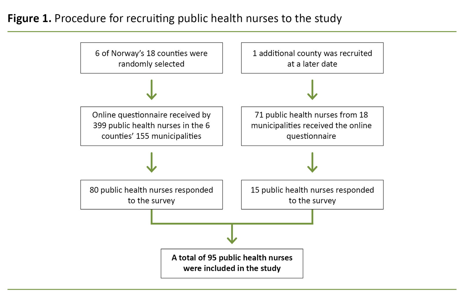 Due to a low response rate, we extended the sample to include an additional county comprising of 18 municipalities. The county was strategically chosen to ensure that both large and small municipalities were represented. In the seven counties, a total of 470 public health nurses were confirmed to have received the email that gave a link to the questionnaire and the information letter (Figure 1).