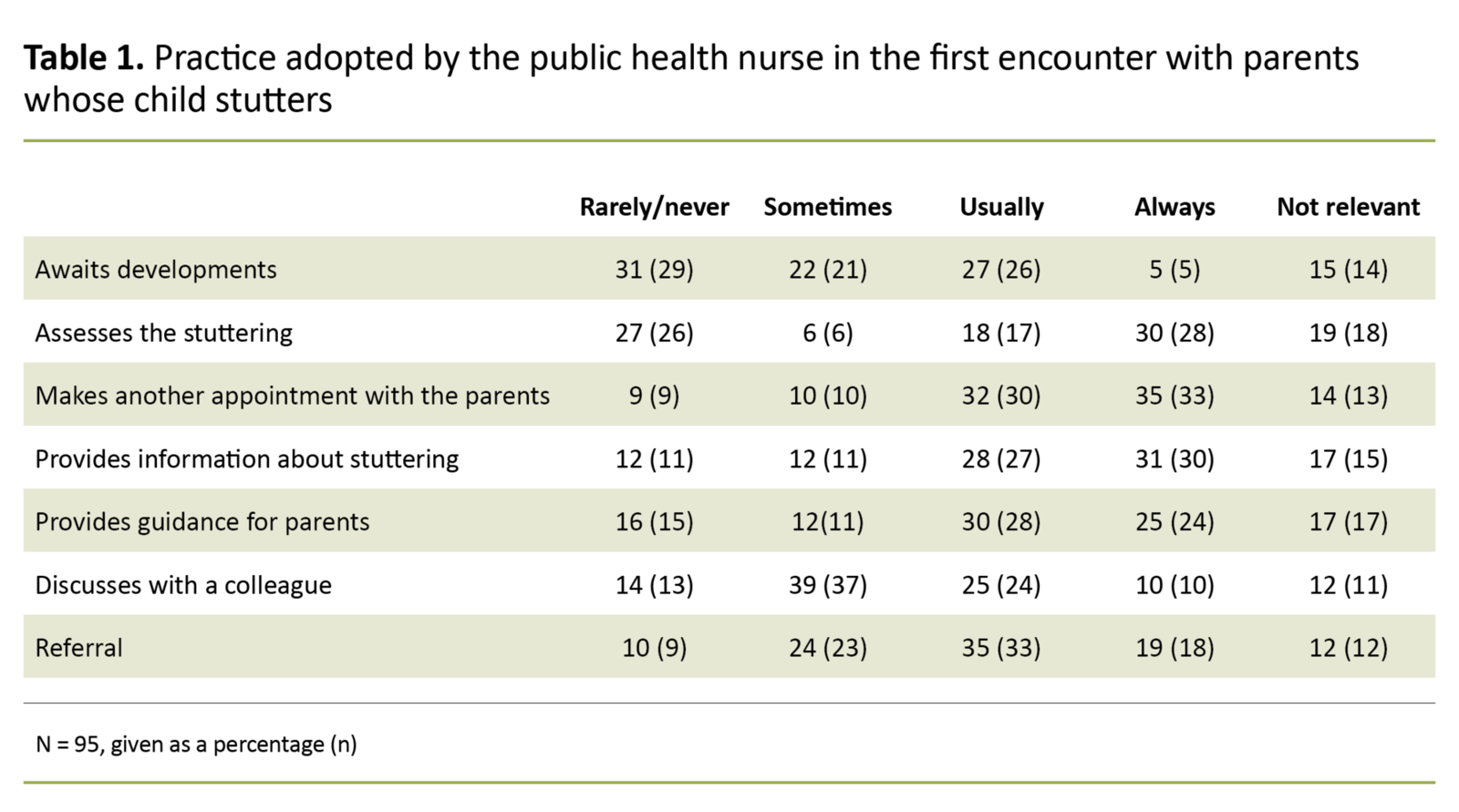 Results: Ninety-five public health nurses completed the questionnaire. Providing information about stuttering and making another appointment with the parents were the practices identified as the most frequently adopted by the public health nurses in their first encounter with the parents of children who stutter. The most commonly provided advice was associated with interaction and communication, and to contact a specialist. When assessing whether to continue to monitor the situation or to give a referral, the public health nurses considered the child’s age, the child’s perception of or reaction to the stuttering, and parental concern. Very few of them had access to written guidelines with respect to appropriate practice and when to contact a speech therapist.