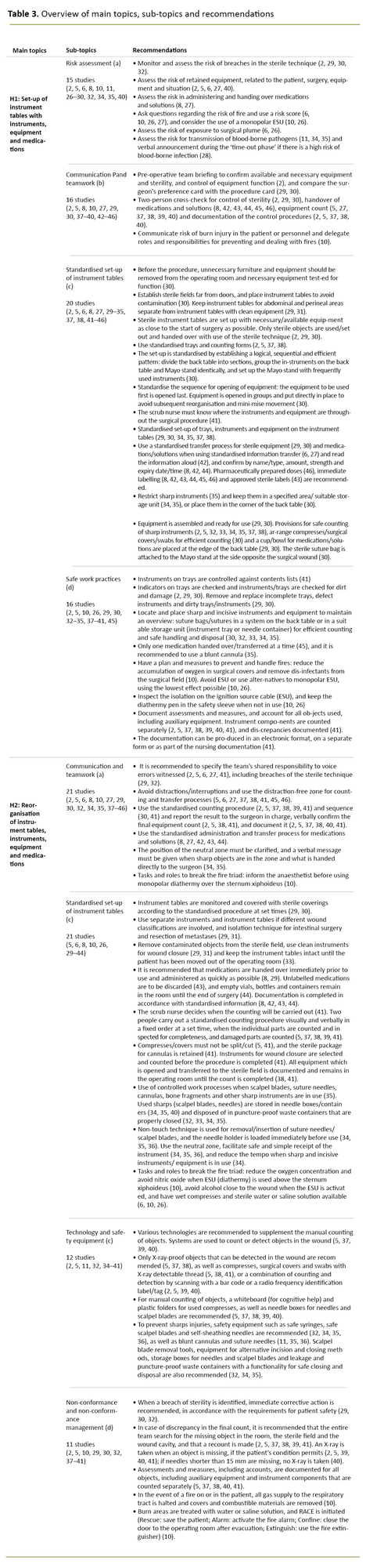 Results: The literature is presented under two main topics: 1) Set-up of instruments, equipment and medications on instrument tables, and 2) Reorganisation of instruments, equipment and medications on instrument tables. The recommendations cover prevention of deviations from sterile technique, sharps injuries, retained surgical items in the patient, handling medication and fire safety. One of the guidelines describes a practical, specific and systematic procedure for setting up instrument tables.