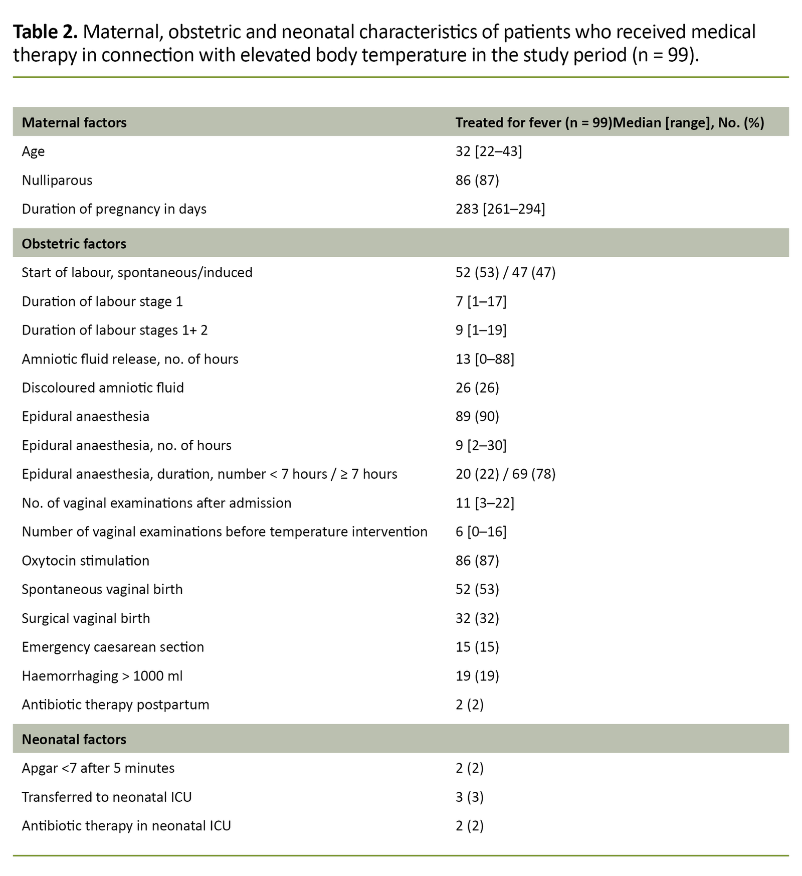 Maternal, obstetric and neonatal characteristics of patients who received medical therapy in connection with elevated body temperature (n = 99) are presented in Table 2.