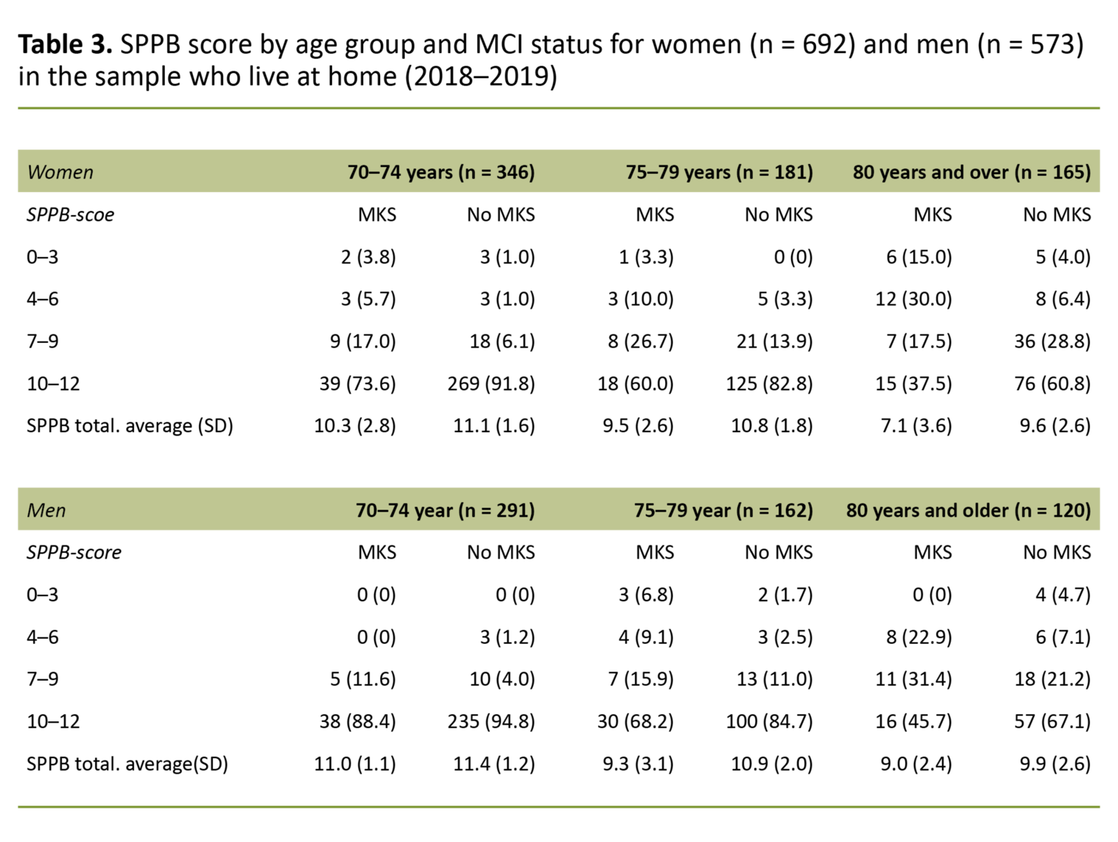 Table 3.  SPPB score by age group and MCI status for women (n = 692) and men (n = 573) in the sample who live at home (2018–19)