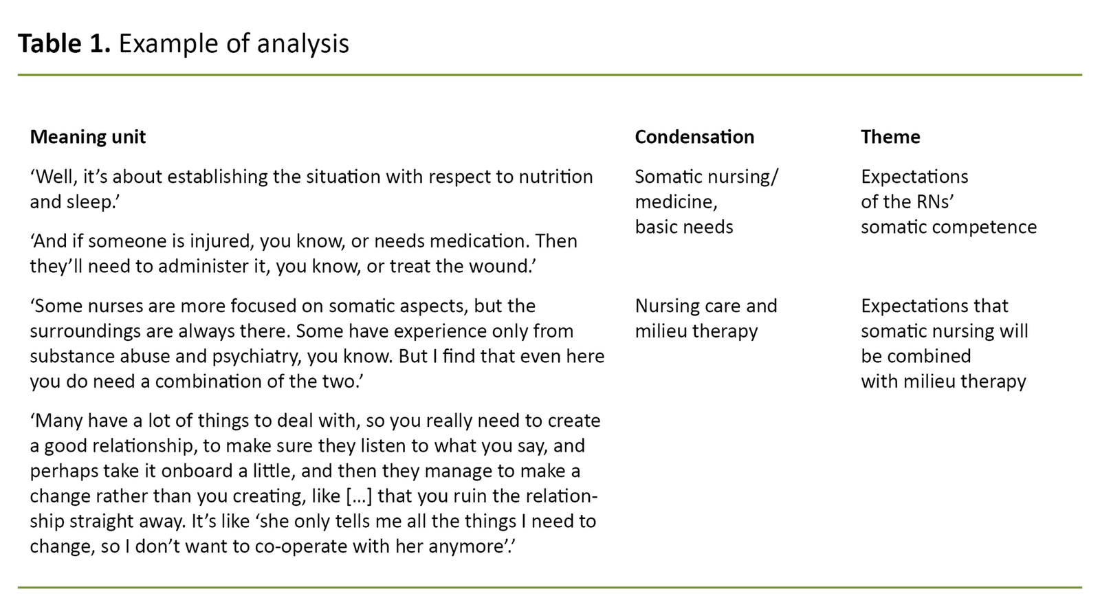 Four main themes emerged from the analysis: ‘Expectations of RNs’ somatic competence’ (bodily phenomena and physical diseases and their treatment), ‘Expectations that somatic nursing will be combined with milieu therapy’, ‘Collaboration with the other professions’ and ‘RNs want a join professional platform’. See an example of the analytic process in Table 1.