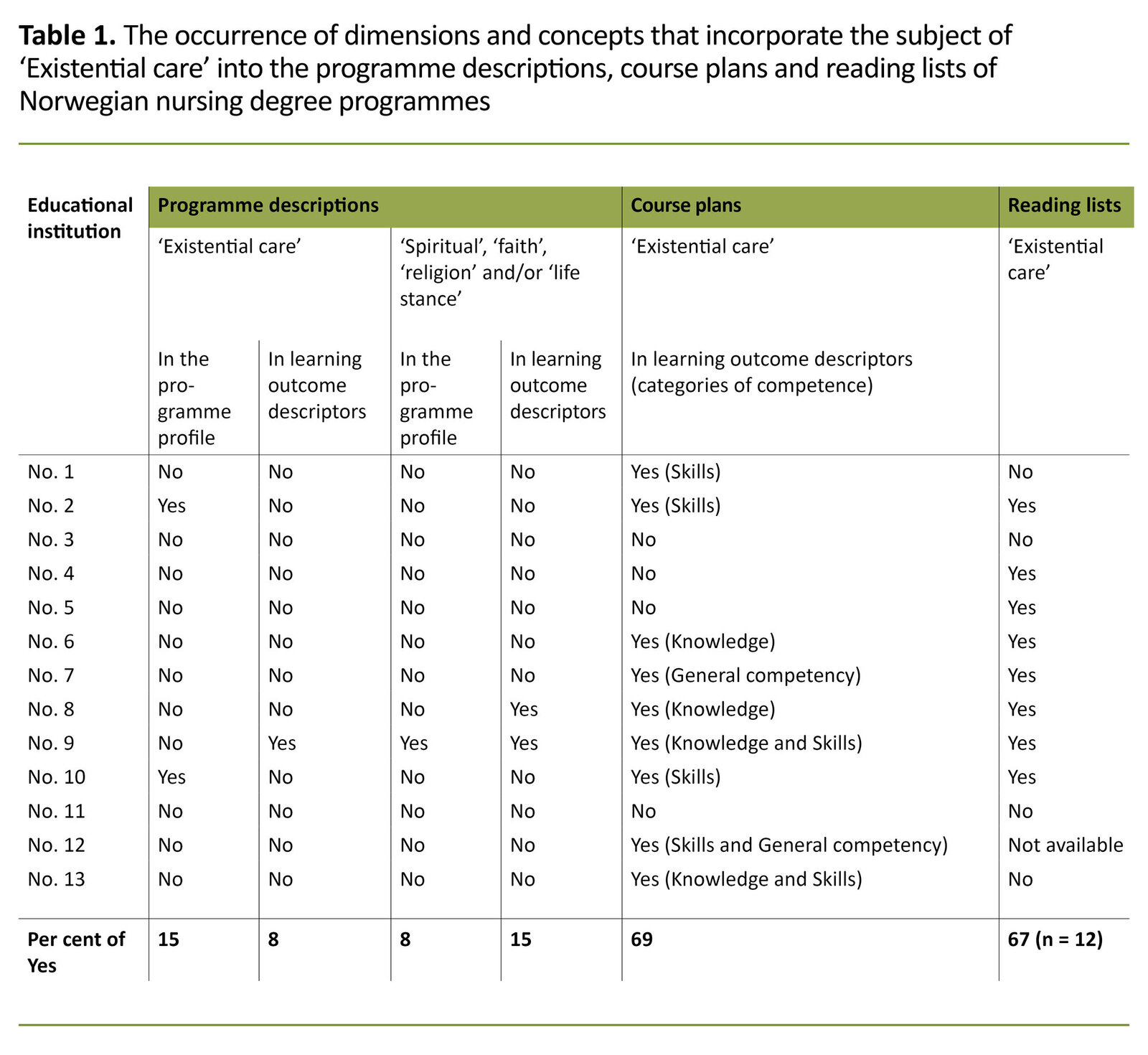 Existential care was thematised in nine of the thirteen education programmes (69 per cent) (Table 1). Eight education programmes (67 per cent) had included ‘existential care’ and/or ‘spiritual care’ as a subject in their reading lists, while a far lower percentage had included it in their programme descriptions (15 per cent) and learning outcome descriptors (8 per cent).