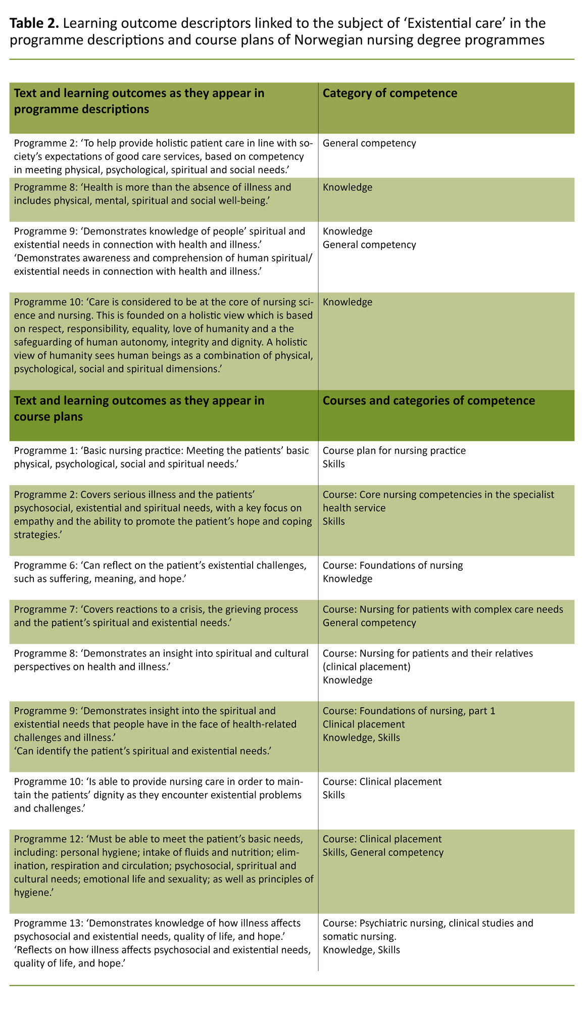 Conclusion: Existential care is well integrated into the programme descriptions, course plans and reading lists of Norwegian undergraduate nursing programmes. Learning outcome descriptors would however benefit from being more precise and easier to verify. There is also a need for the knowledge and skills aspects of the competency requirements to be given equal status. The new national guidelines for nursing education accommodate this need, which gives an even clearer signal that existential care must be an integral part of the education programmes.