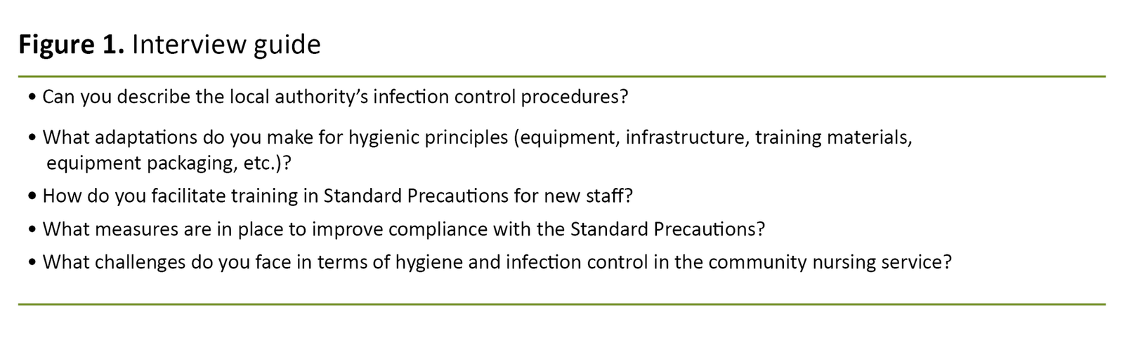 The questions in the semi-structured interview guide related to practices and staff training in Standard Precautions (Figure 1). The guide was based on previous research on compliance with infection control (14, 15, 23, 24).