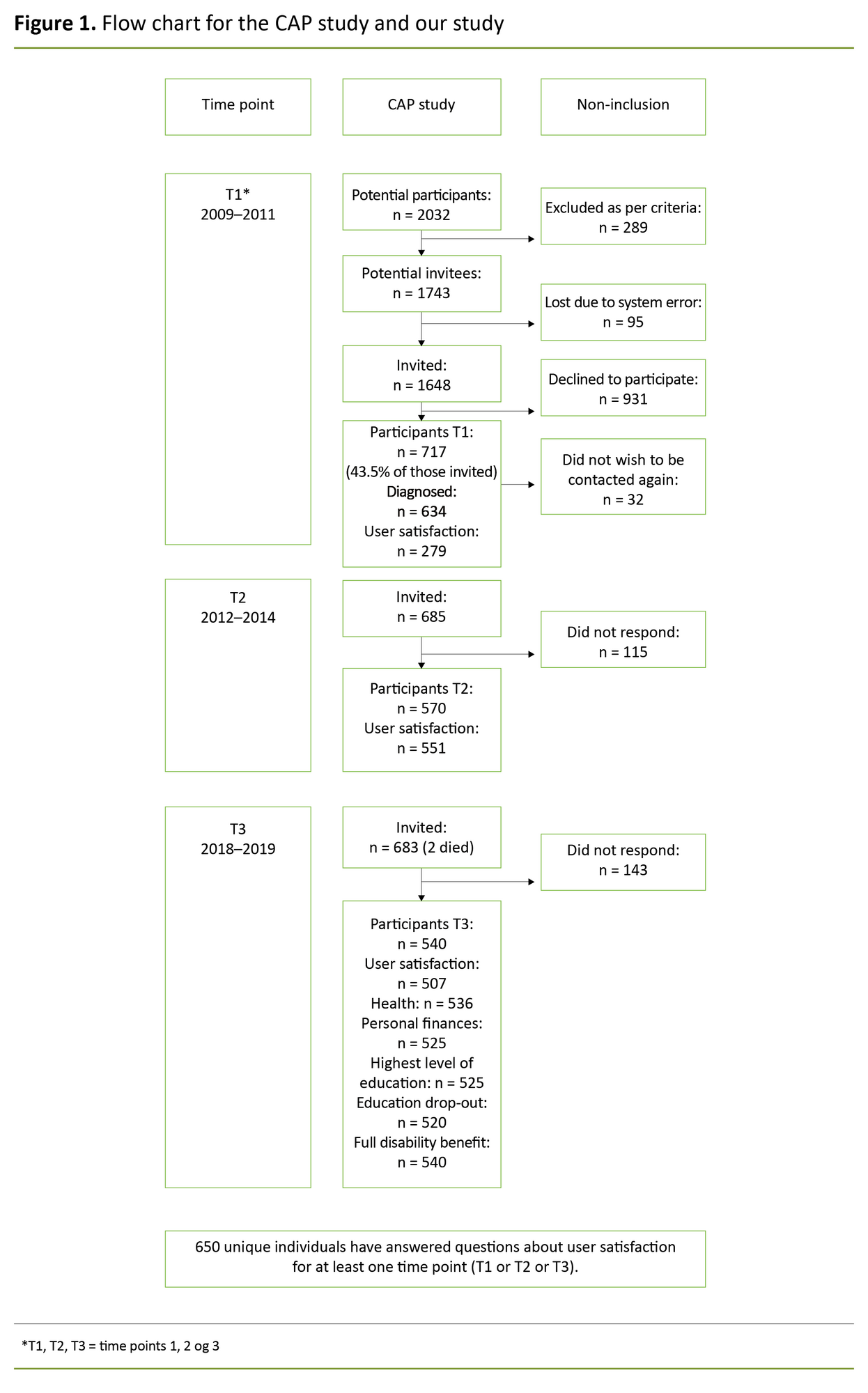 At the first time point (T1), the median age of participants was 15.6 years and 55% of the sample were girls. In the CAP study, 650 unique individuals responded to questions regarding user satisfaction at one point or at several points in time. Figure 1 provides a more detailed presentation of the sample in the CAP study and in our study.
