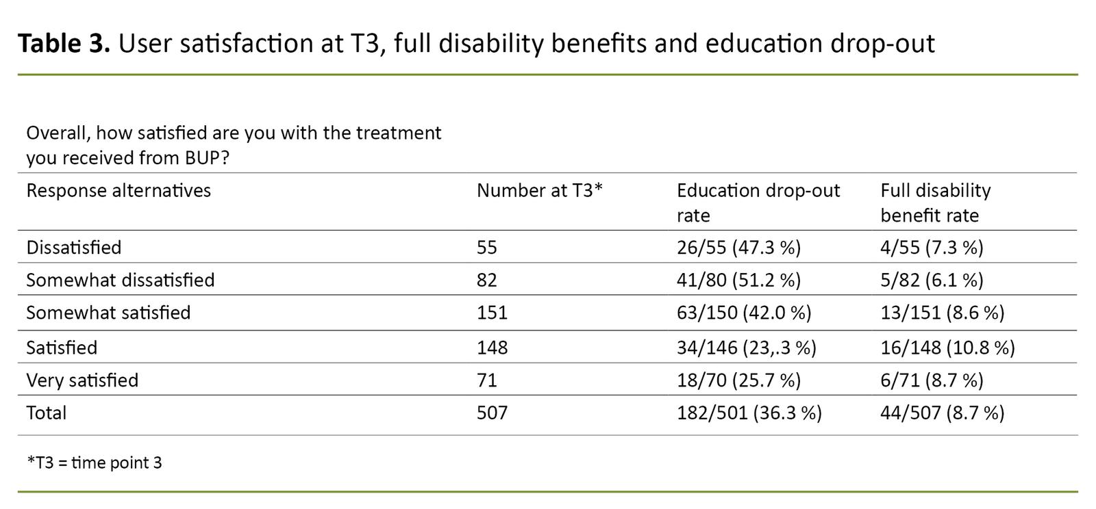 We used logistic regression with the drop-out rate in education and the receipt of full disability benefits, one at a time, as dependent variables, and user satisfaction as independent variable.