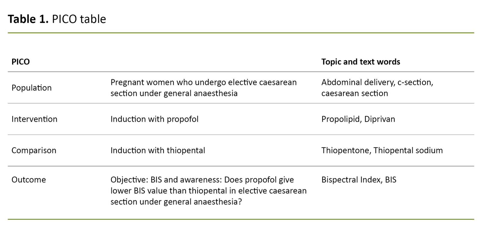 The aim of this systematic review was to investigate whether there is a difference in BIS values throughout the whole course of anaesthesia following induction with propofol versus thiopental in elective caesarean section. The following research question is addressed: