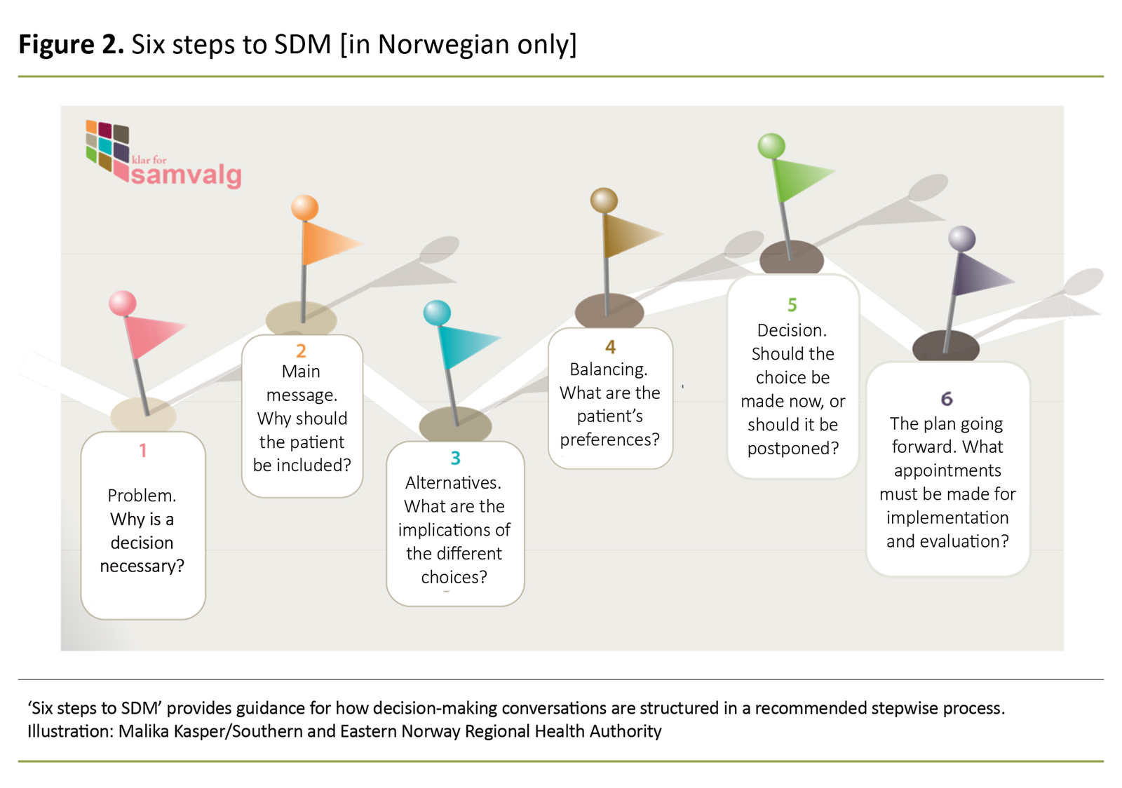 An SDM process is then carried out backed up by the ‘Six steps to shared decision-making’ memo card. This can be used in decision coaching, followed by a summary including dialogue, reflection and questions. Further information on the development and generic contents of several of the training modules in the ‘Ready for SDM’ framework is provided elsewhere (14, 15).