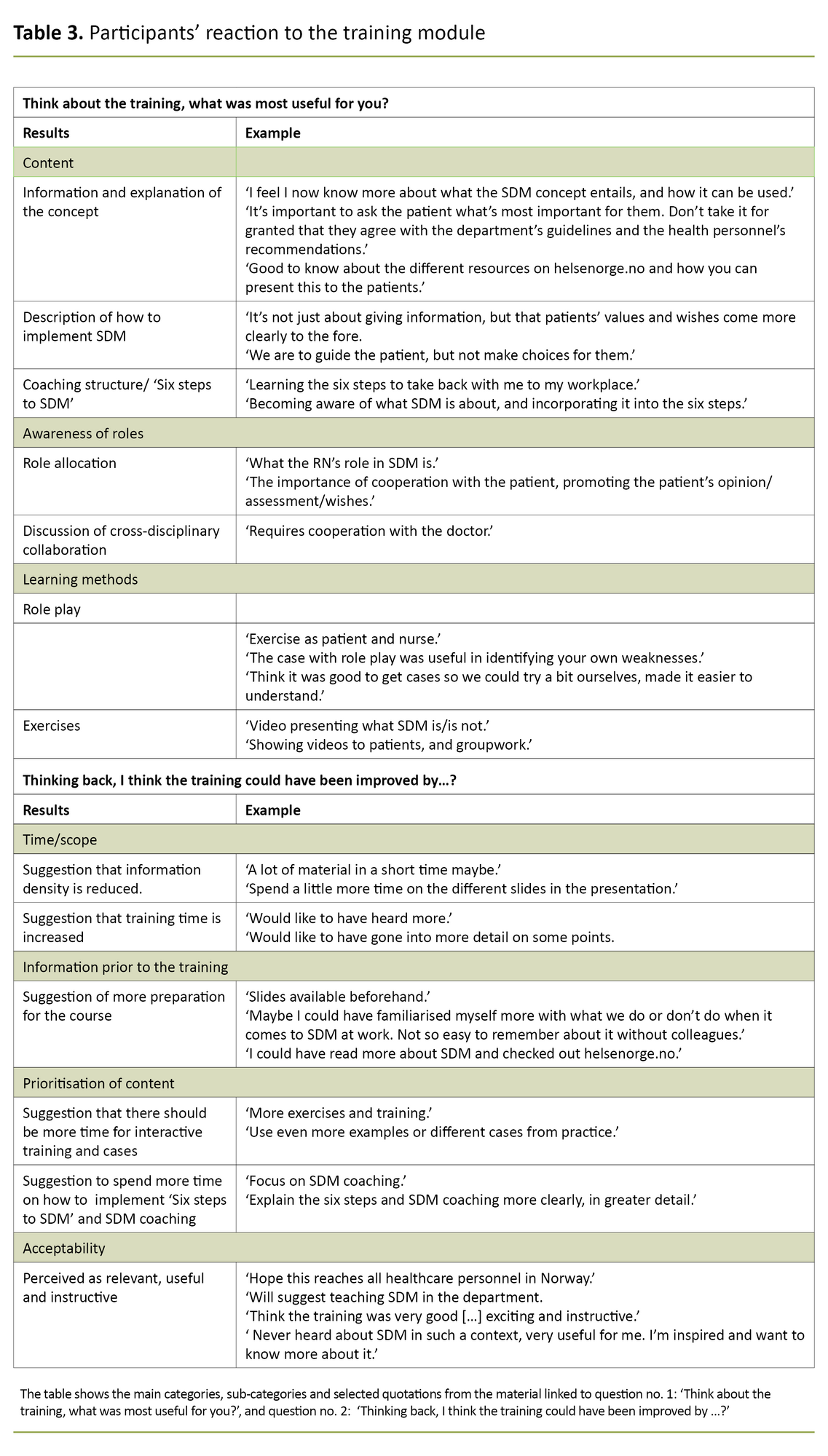 The following quotations substantiate this: ‘Training, memo card to use in practice’, ‘Further training in coaching, clarification of how it can be implemented in the ward’, ‘Lack of knowledge about this, the goal and lots of training’, ‘I wasn’t so aware before about how to carry out SDM conversations in consultation with patients. But now I can try to use it more actively’, and ‘Include training on this during a professional development day so that we do it together’.