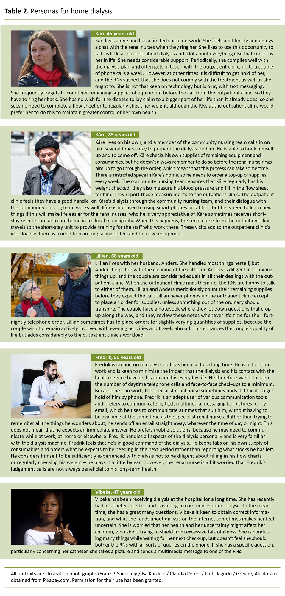 Personas can therefore also shed light on the interaction between the patients’ everyday lives with home dialysis and the renal nurses’ organisation and implementation of their work. The personas were not intended to describe the renal nurses’ work in detail, because the renal nurses were able to contribute actively as participants in the development process.