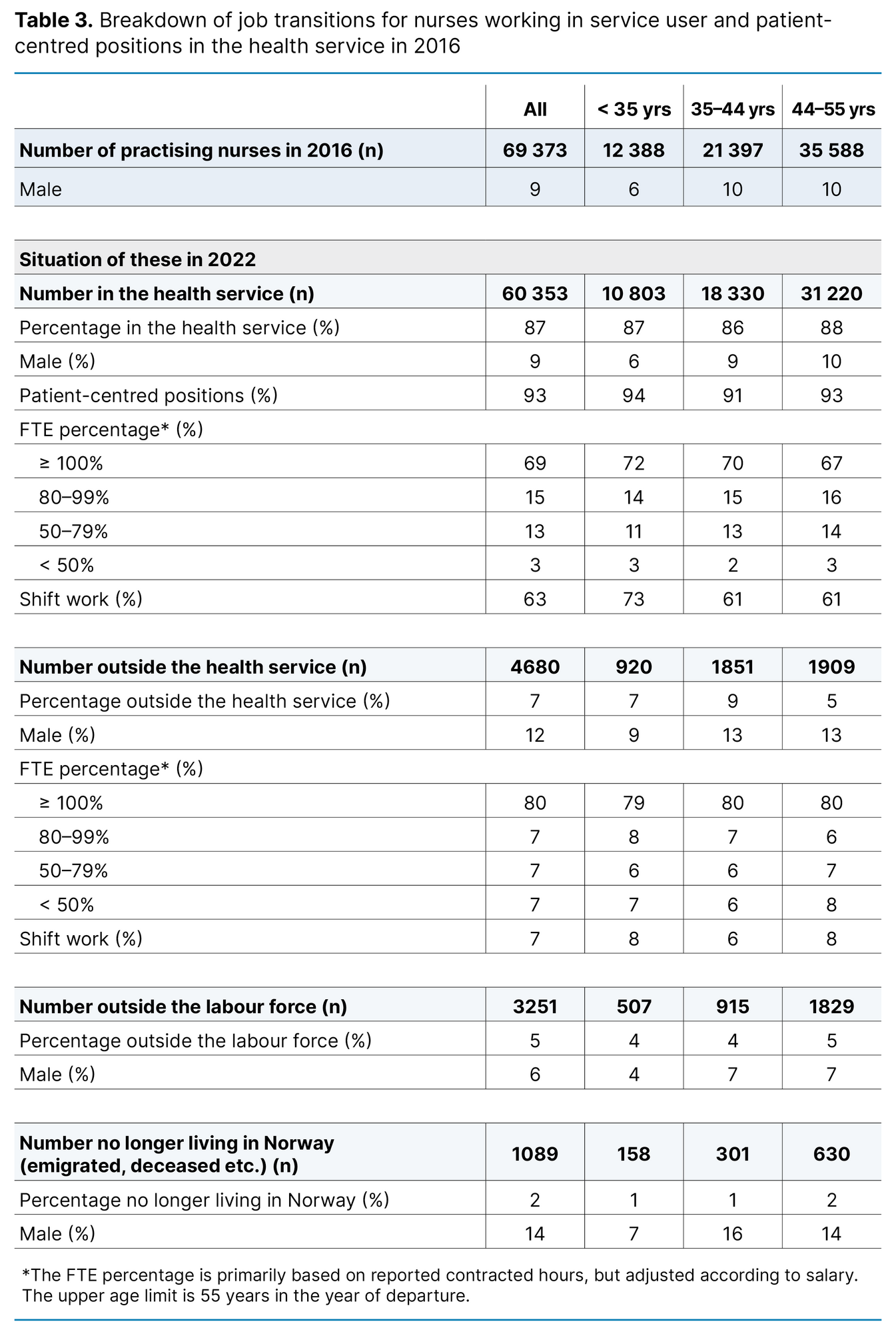 Descriptive statistics have been created for the number and proportion of nurses, FTE percentages and proportion of shift work overall and by age category (< 35, 35–44, 45–59, 60+ years) in and outside the health service in 2022. When exploring job transitions, we started with all nurses working in patient-centred roles in the health service in 2016 and examine the situation in 2022, six years later. In Appendix 1, we also present changes over a short time perspective, from 2021 to 2022, i.e. one year later.