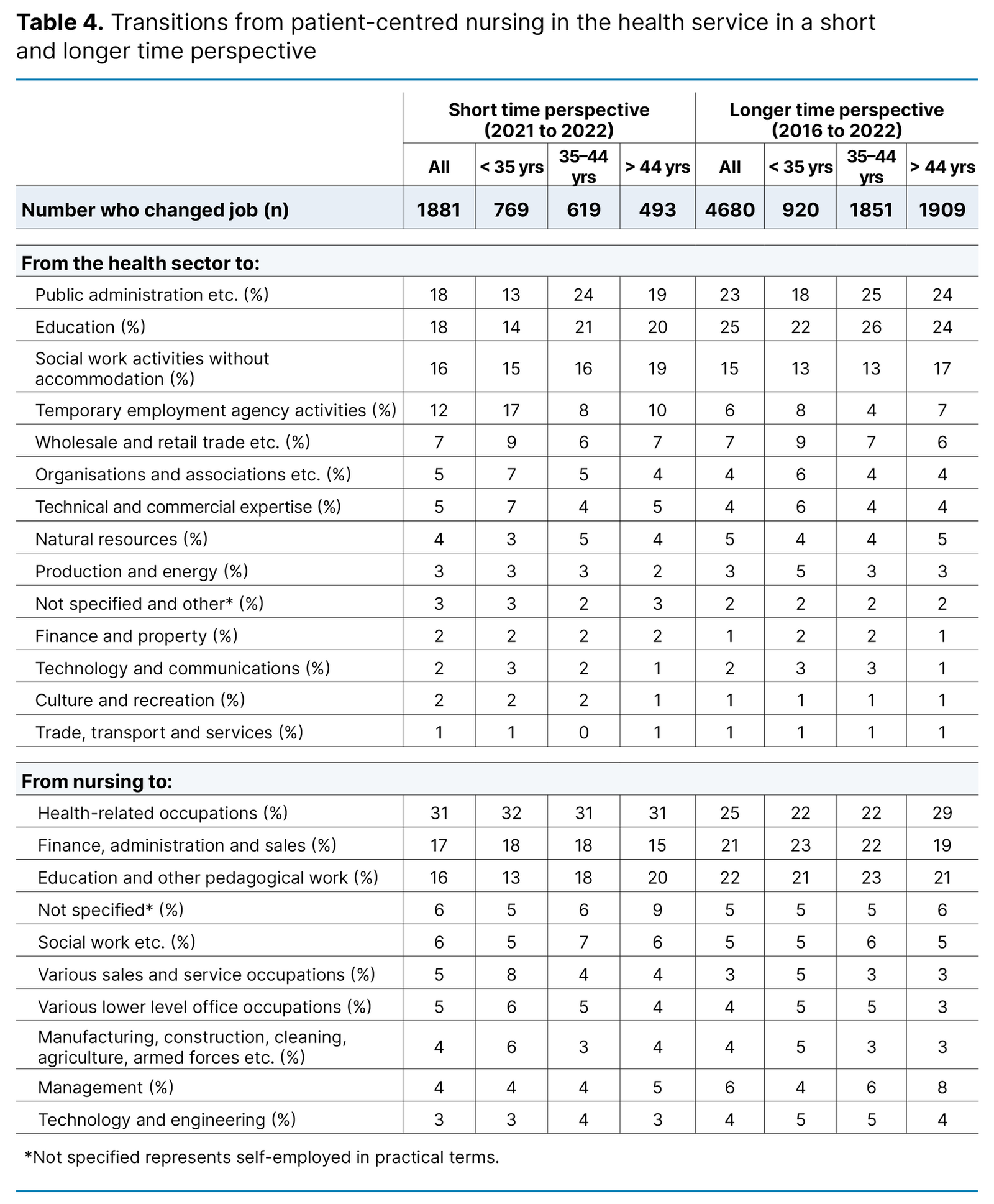 Method: Using descriptive analyses of register data from Statistics Norway, we shed light on the current situation. We examine transitions to and from patient-centred nursing in the health and care industry in a short and longer time perspective.