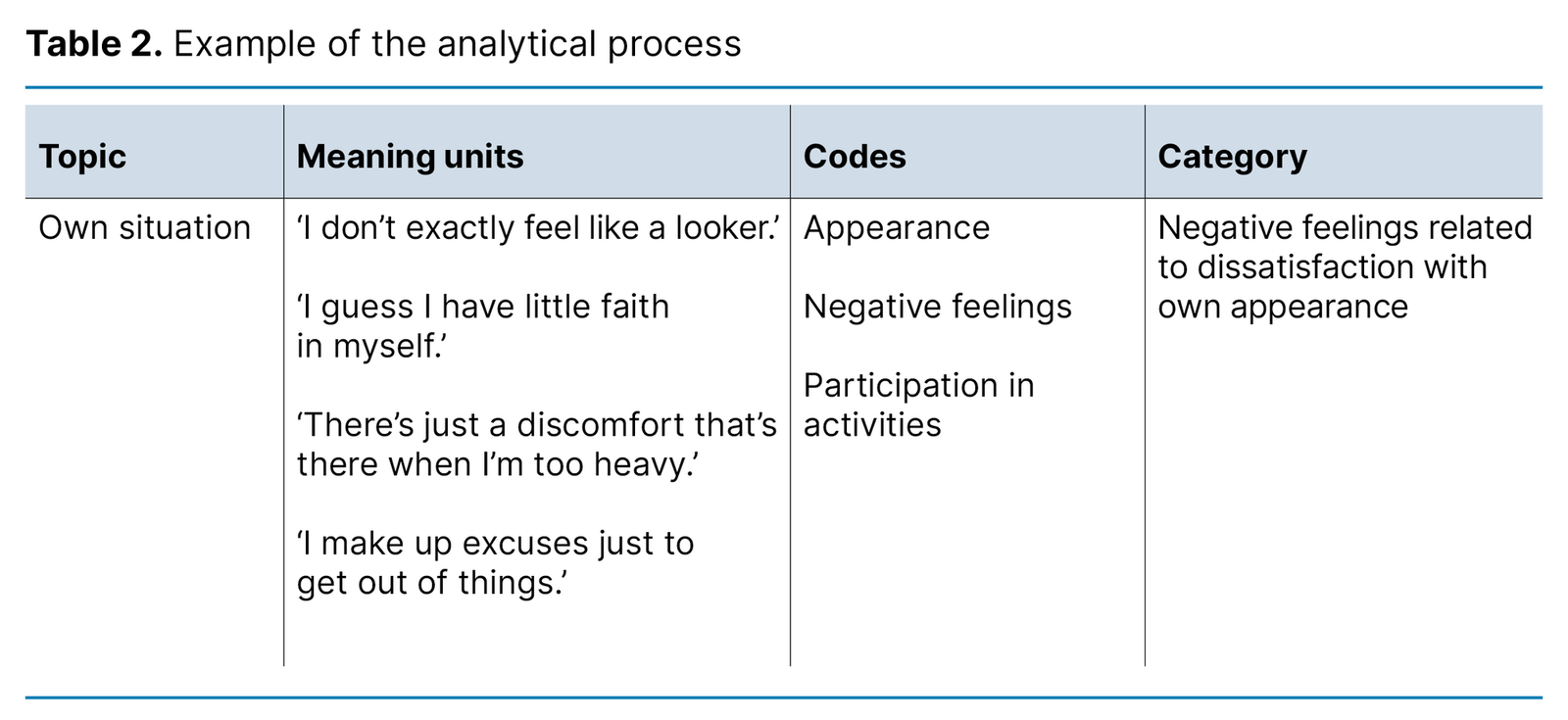 Results: A key finding of the study was that overweight was linked to appearance. This posed the greatest challenge and concern in relation to being overweight and could impact various aspects of life. Young adults were not concerned about the risk of future weight gain and the associated health risks. Insight into health risks and causal relationships varied and was generally lower among young adults. Losing weight provided the informants with insight but also increased their concern about their health and gaining weight.