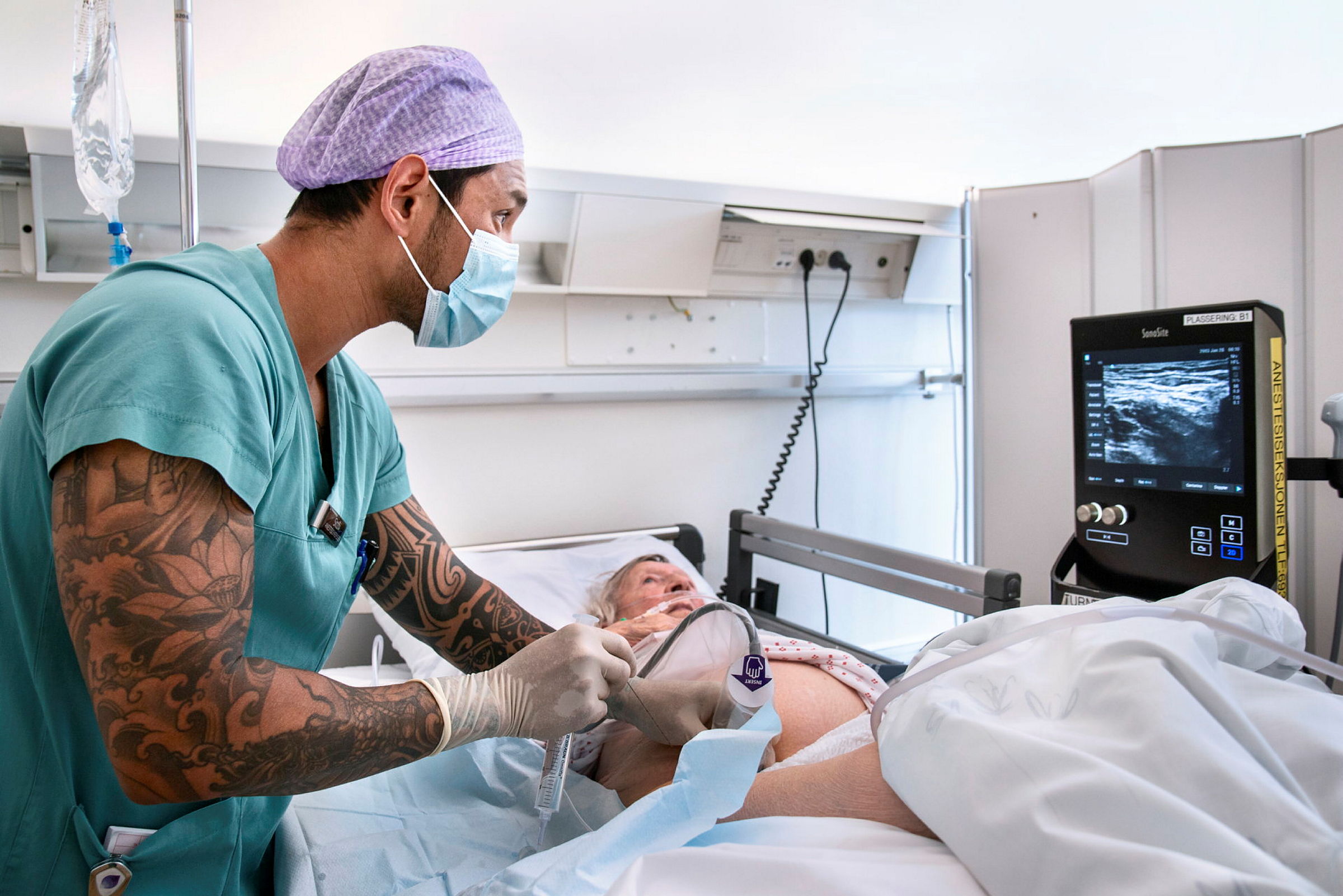 Anestesisykepleier Sitthi Bredesen setter ultraveiledet nerveblokade på Solveig (90) som har brukket hoften.