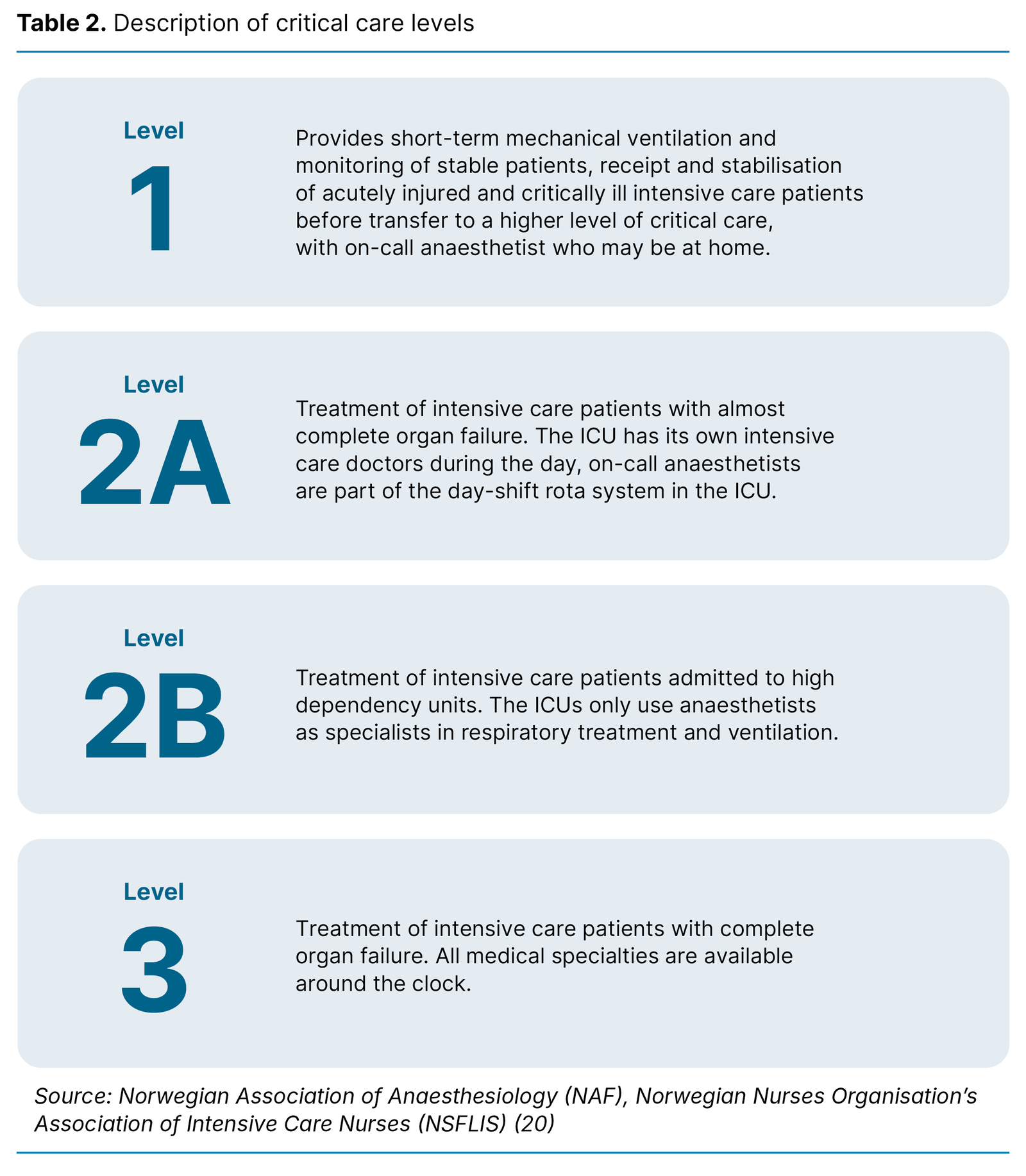 Nine of the participants had worked in an ICU for a period of a few months to ten years before specialising in intensive care nursing. For anonymisation purposes, we do not disclose the individual participants’ length of service. In Norway, ICUs are classified in four levels (20). The higher the level, the more complex the treatment modalities and the requirement for round-the-clock staffing by specialist intensive care personnel (Table 2). The participants in the study worked in level 1 and level 2B ICUs.