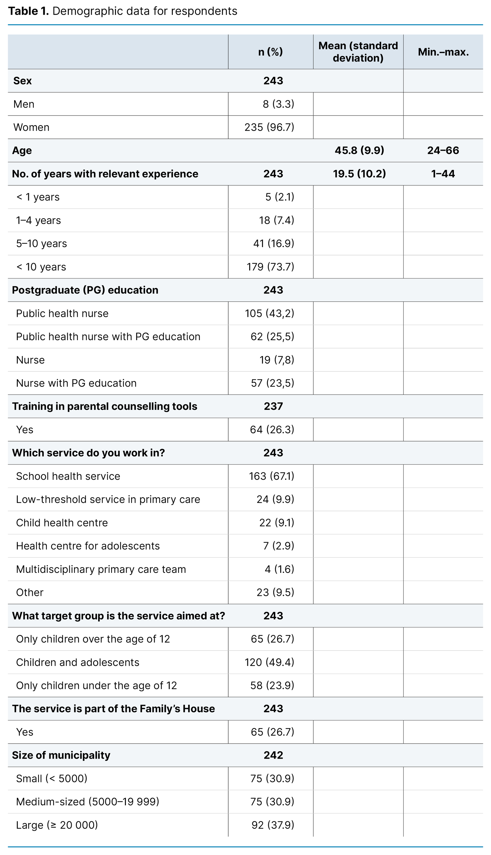Table 1 shows demographic data for the respondents. When we compared those who completed the survey with those who did not complete the full survey, we found more participants who worked solely with adolescents and in the school health service among those who completed it (Appendix 2 – in Norwegian only).